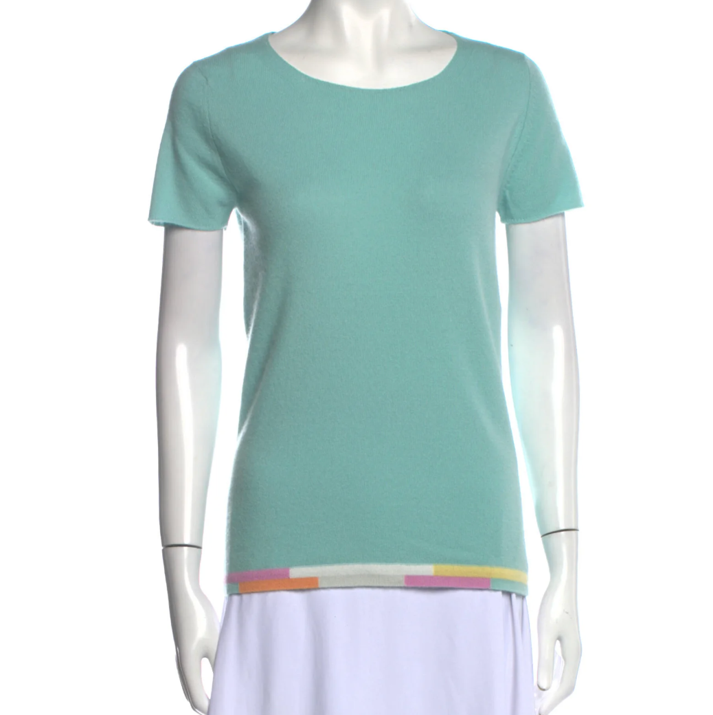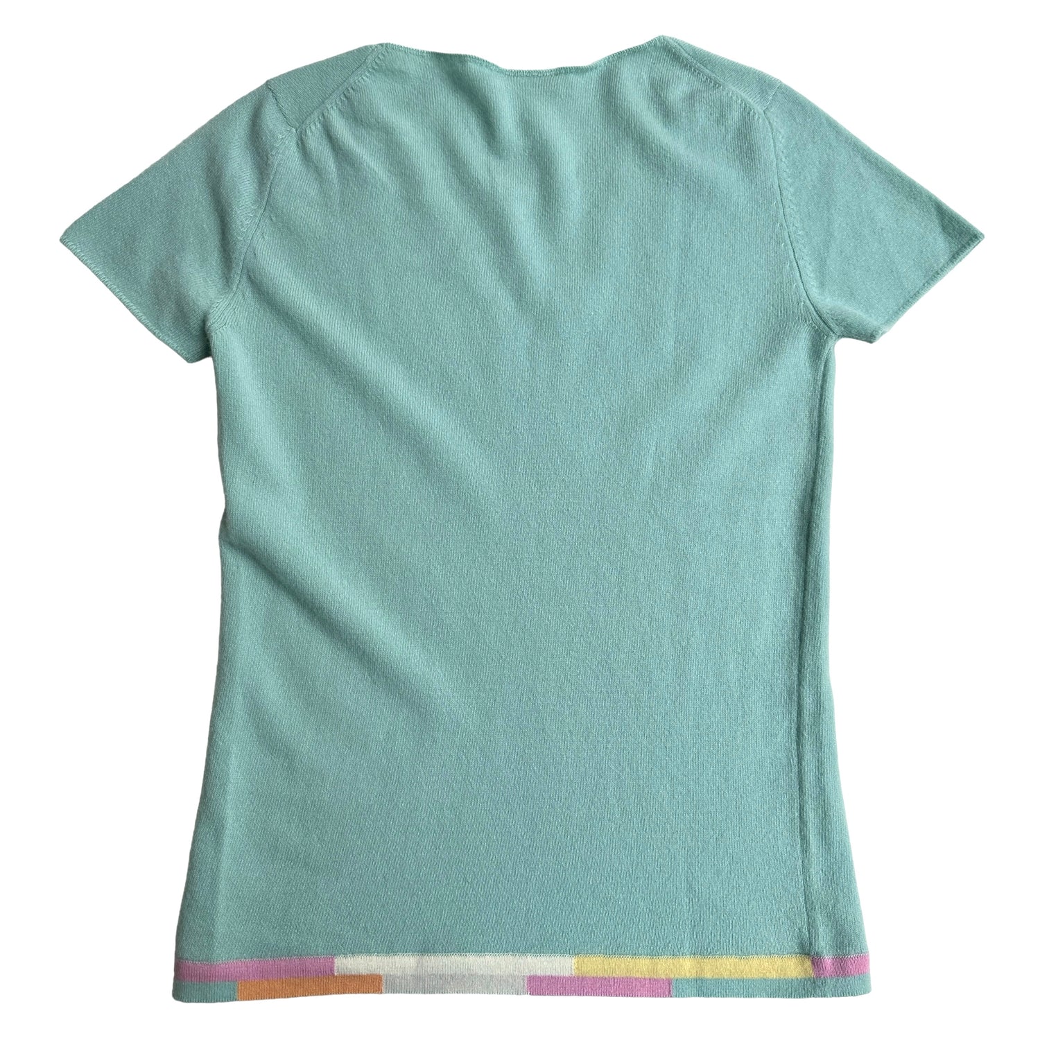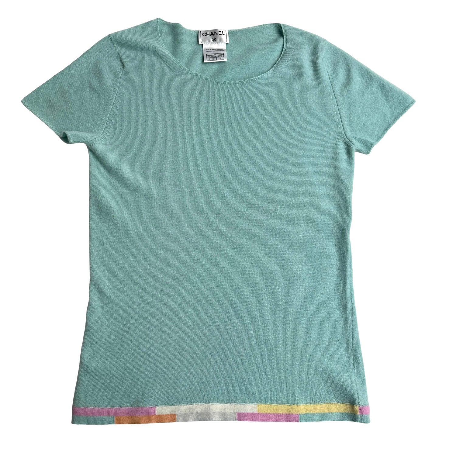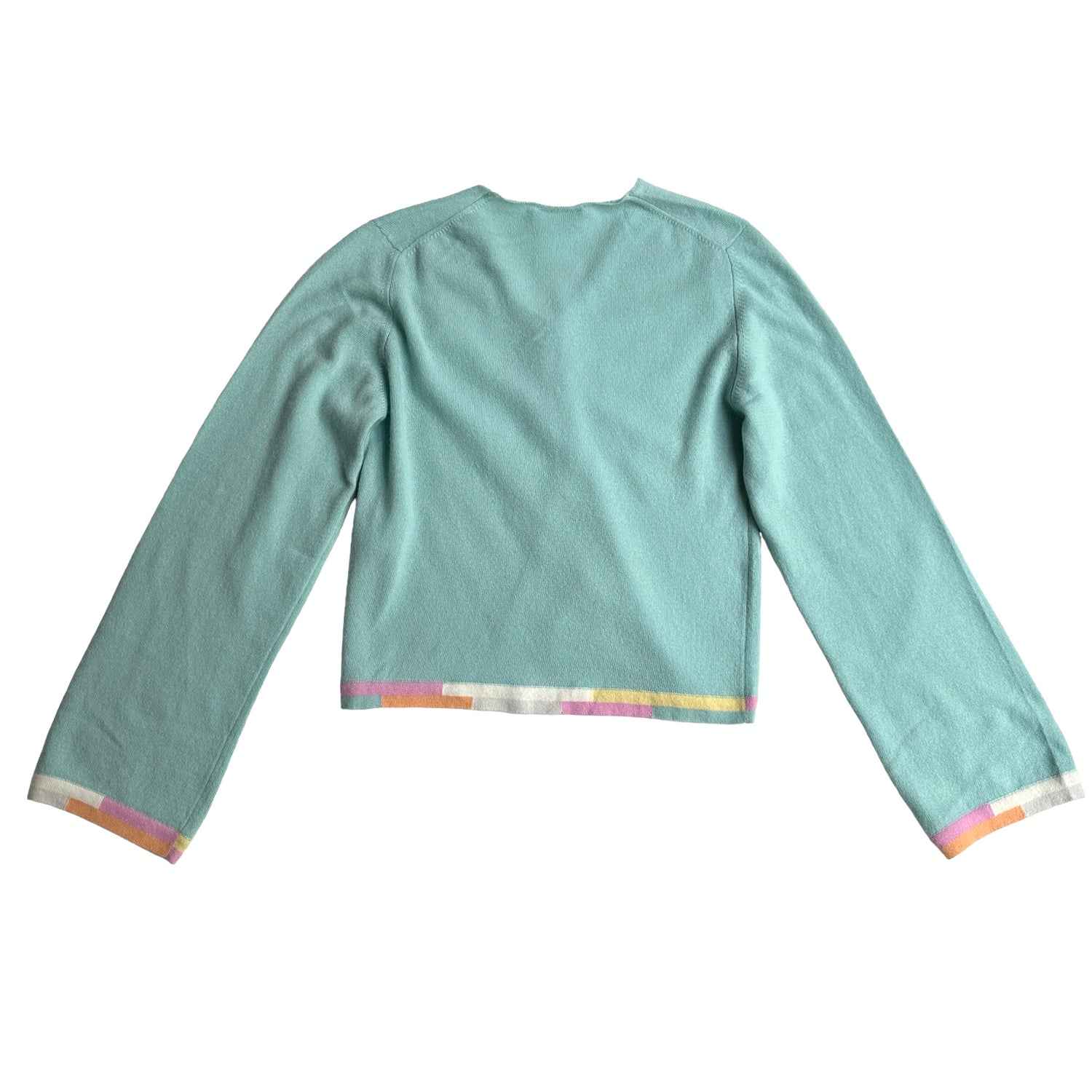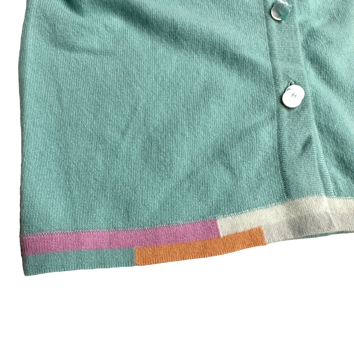 Chanel Cashmere Cardigan set. From the Cruise 1999 Collection by Karl Lagerfeld. Matching cashmere top underneath cardigan or wear both separately. Vintage. Blue cashmere. Interlocking CC logo at mother-of-pearl buttons. Long sleeve sweater with scoop neck. Designer size 38.