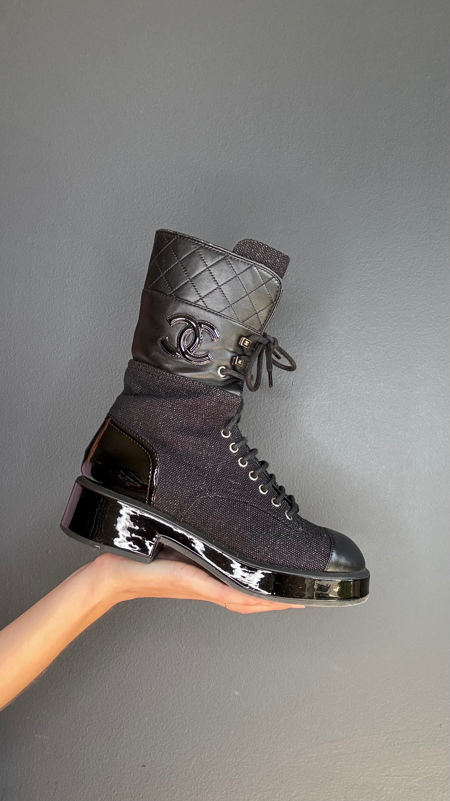 Chanel black denim, lambskin, and patent leather lace up combat boots w/ CC at sides. Designer size 38.5