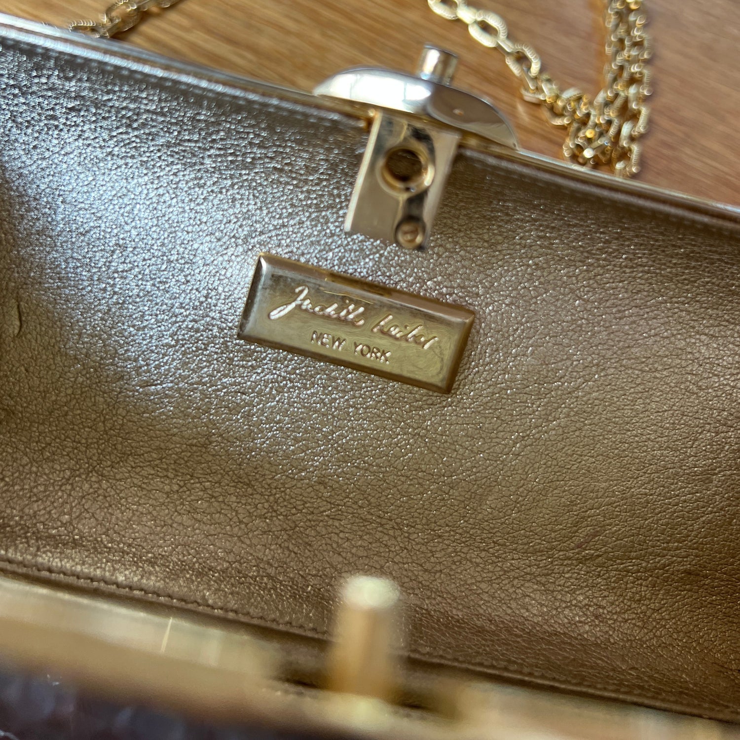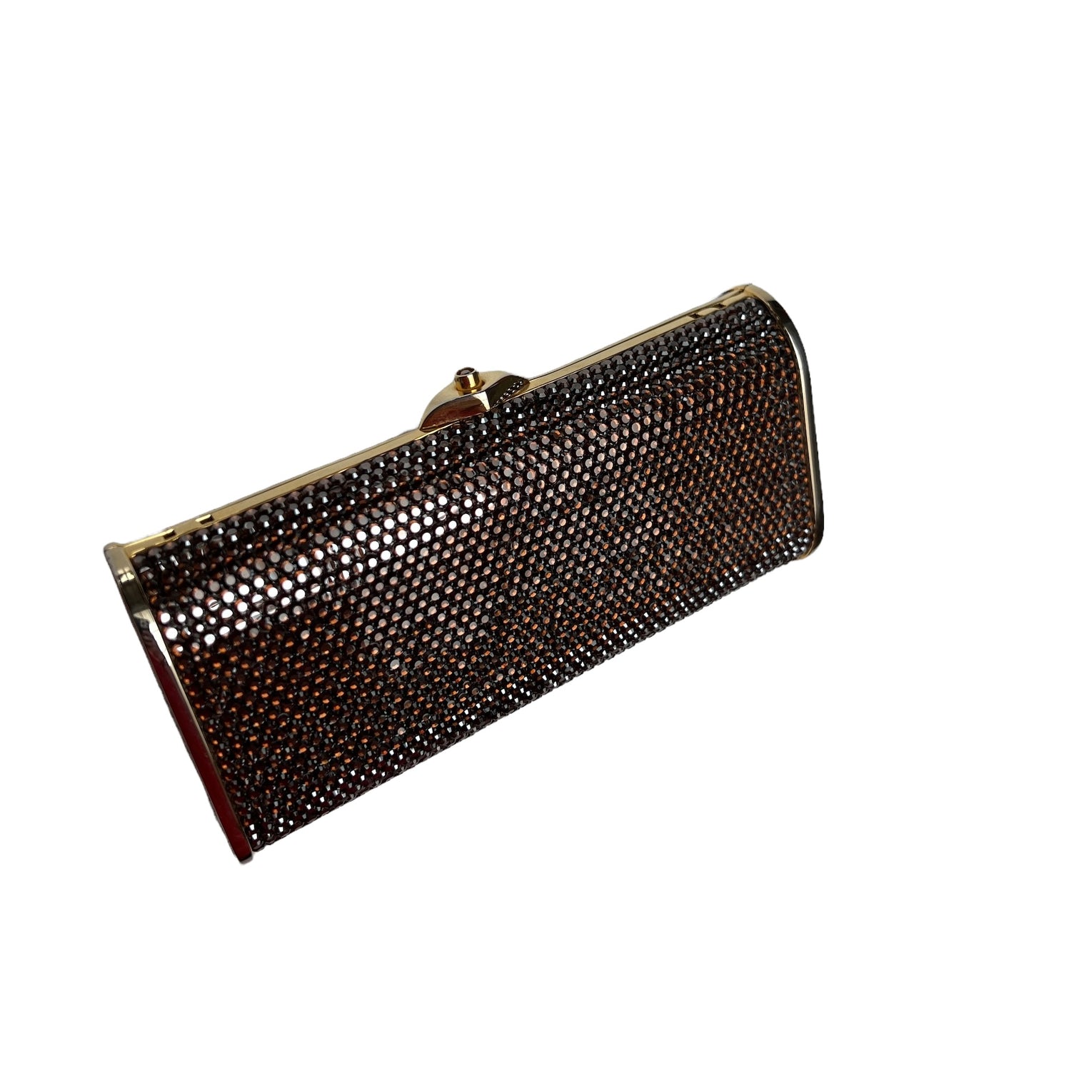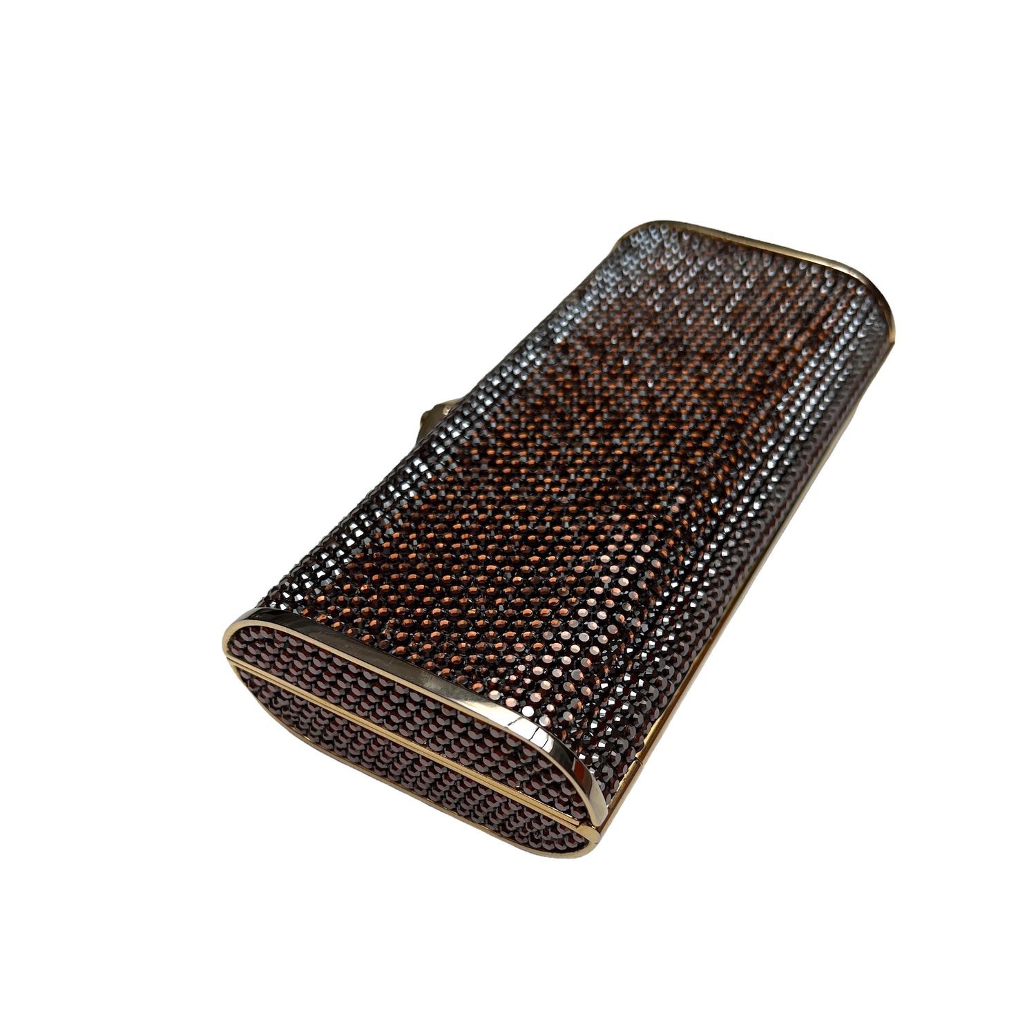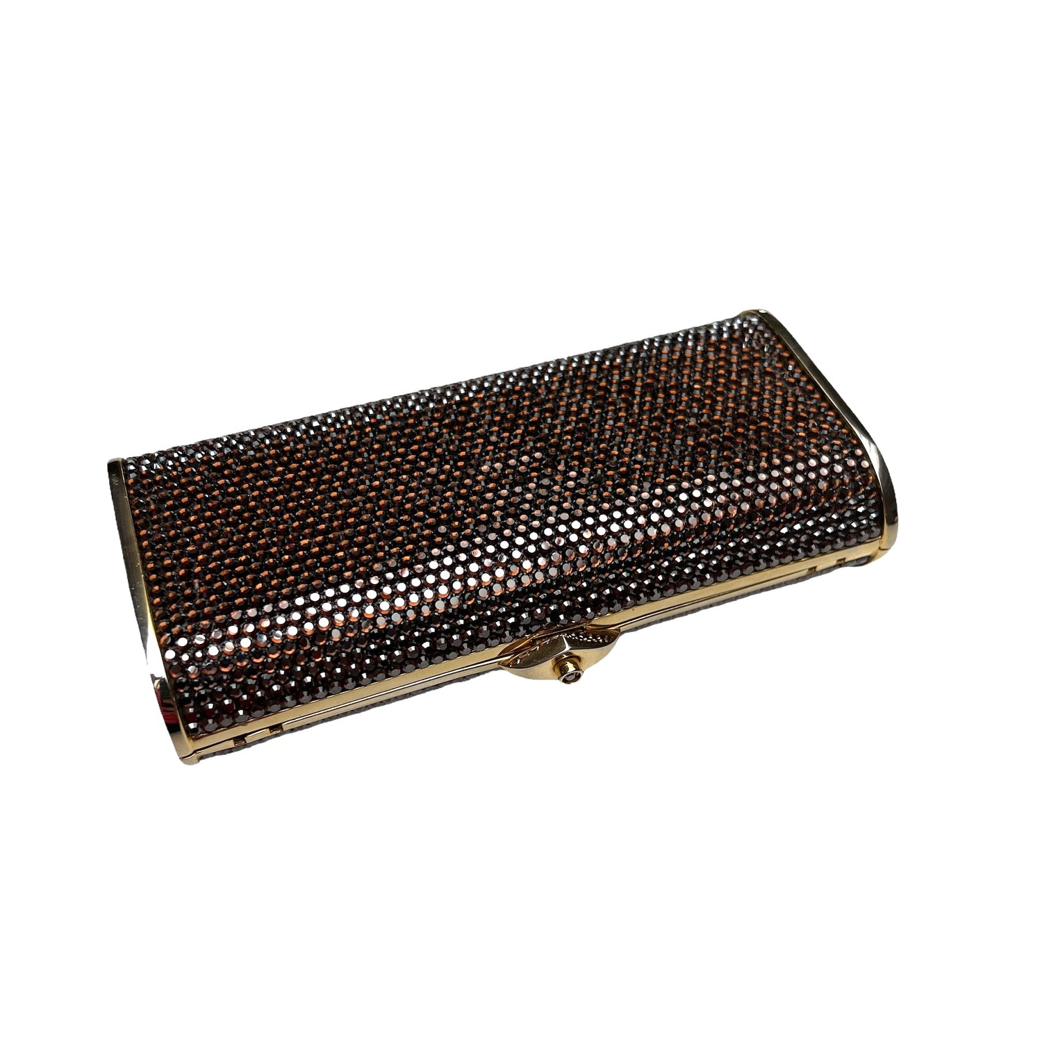 Stunning Judith Leiber Classic Clutch Box. In a champagne color with gold tone hardware. The chain can be worn out or in depending on the style needed for the occasion. Crystals covered box. Gold tone leather lining.