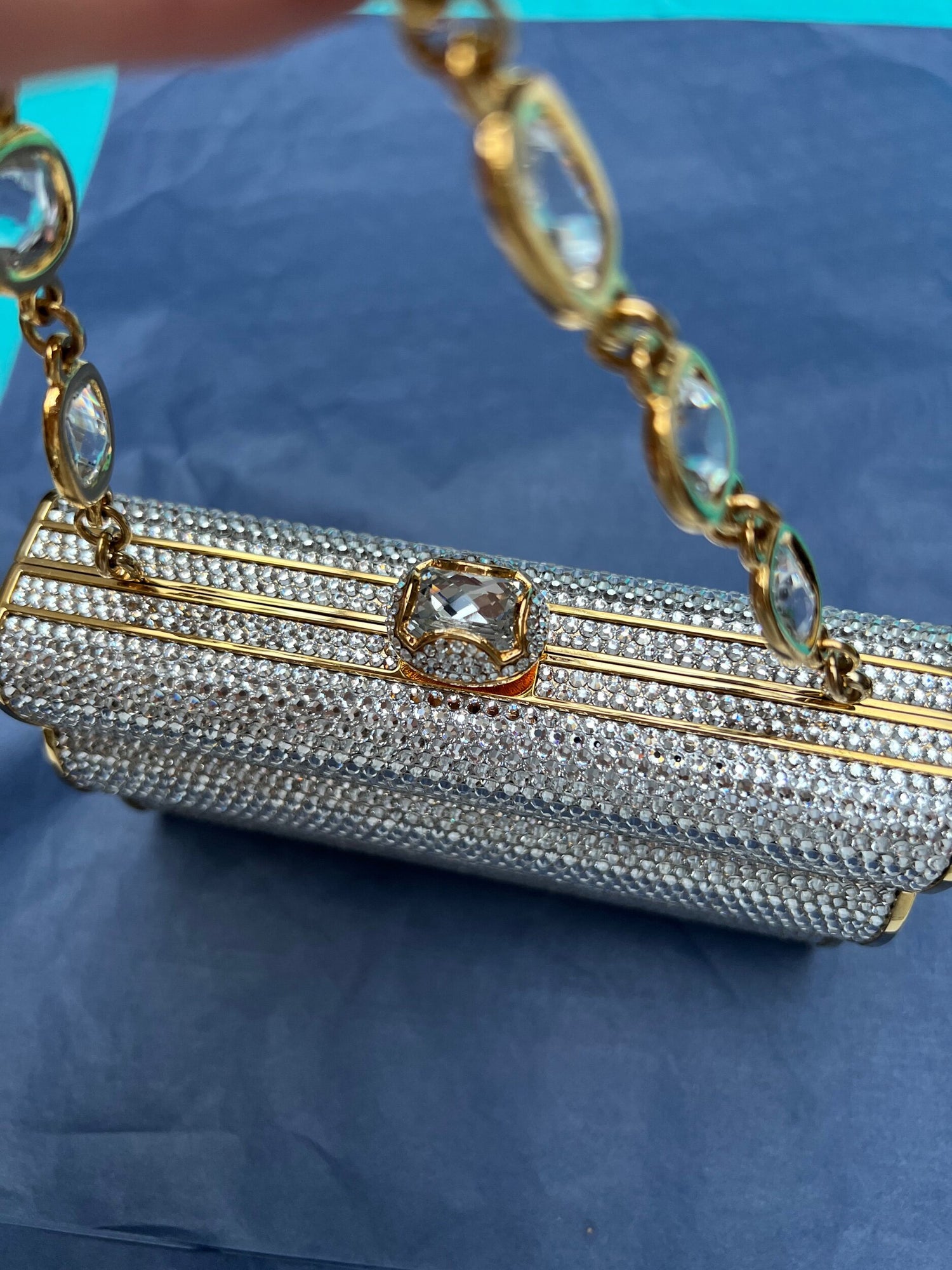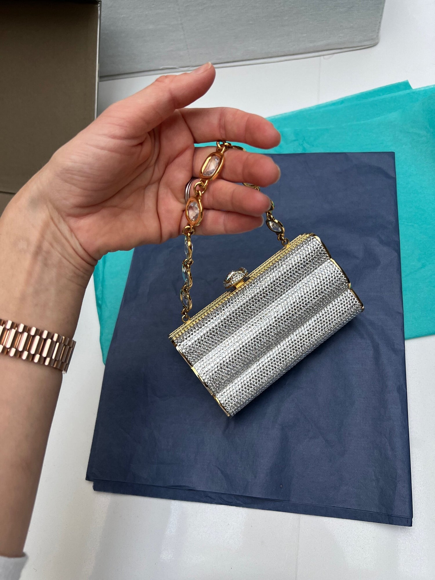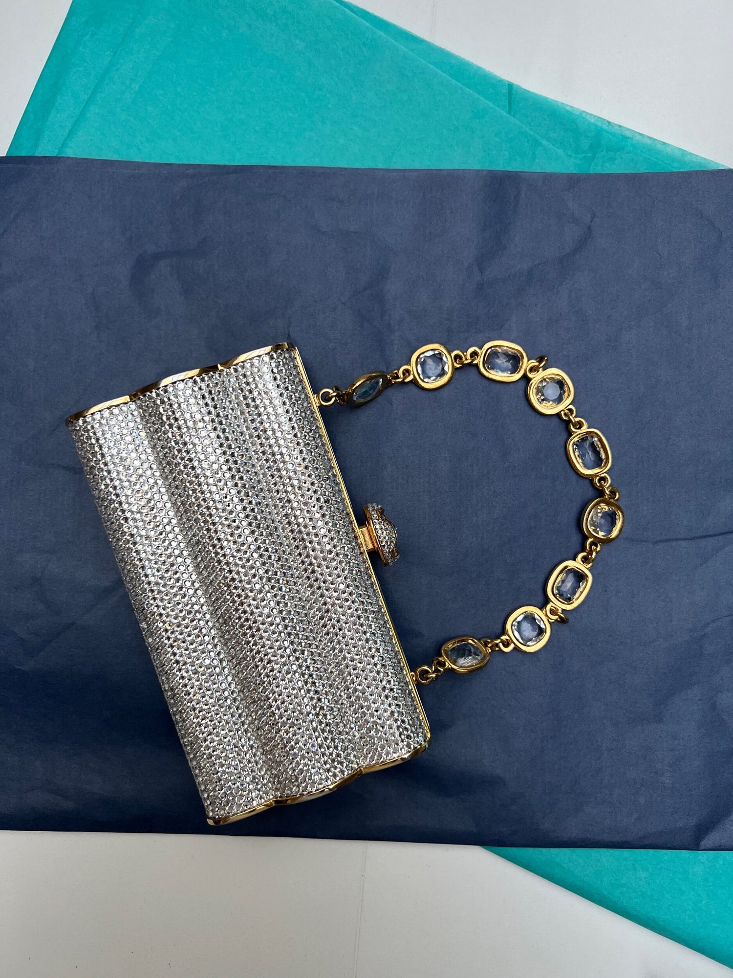 Color: silver crystals and gold hardware.