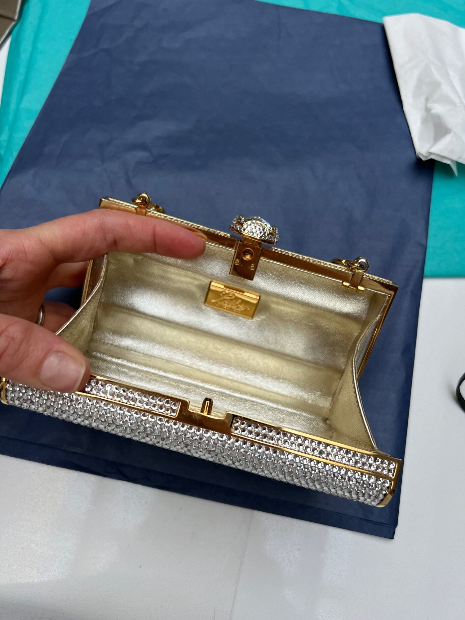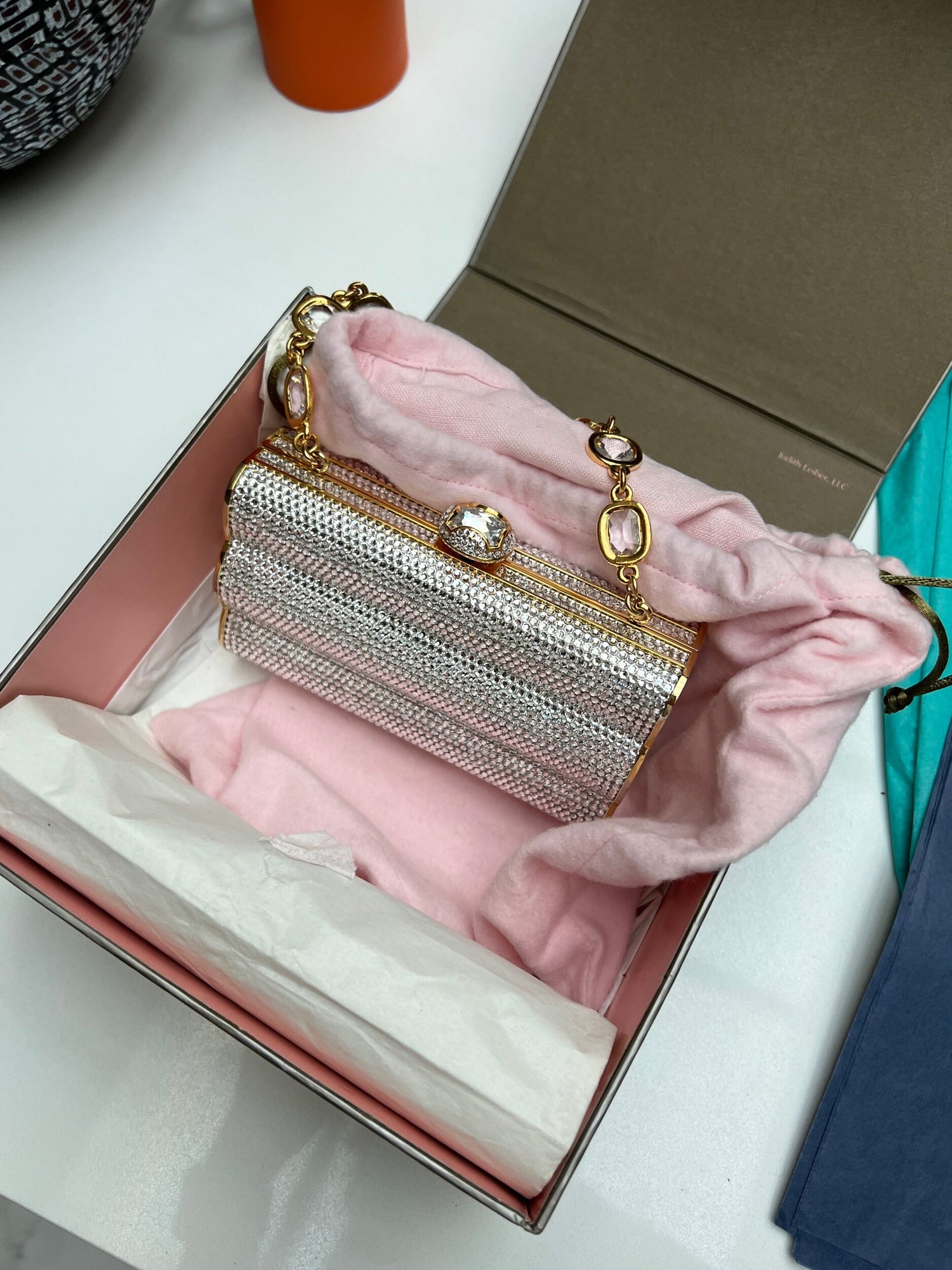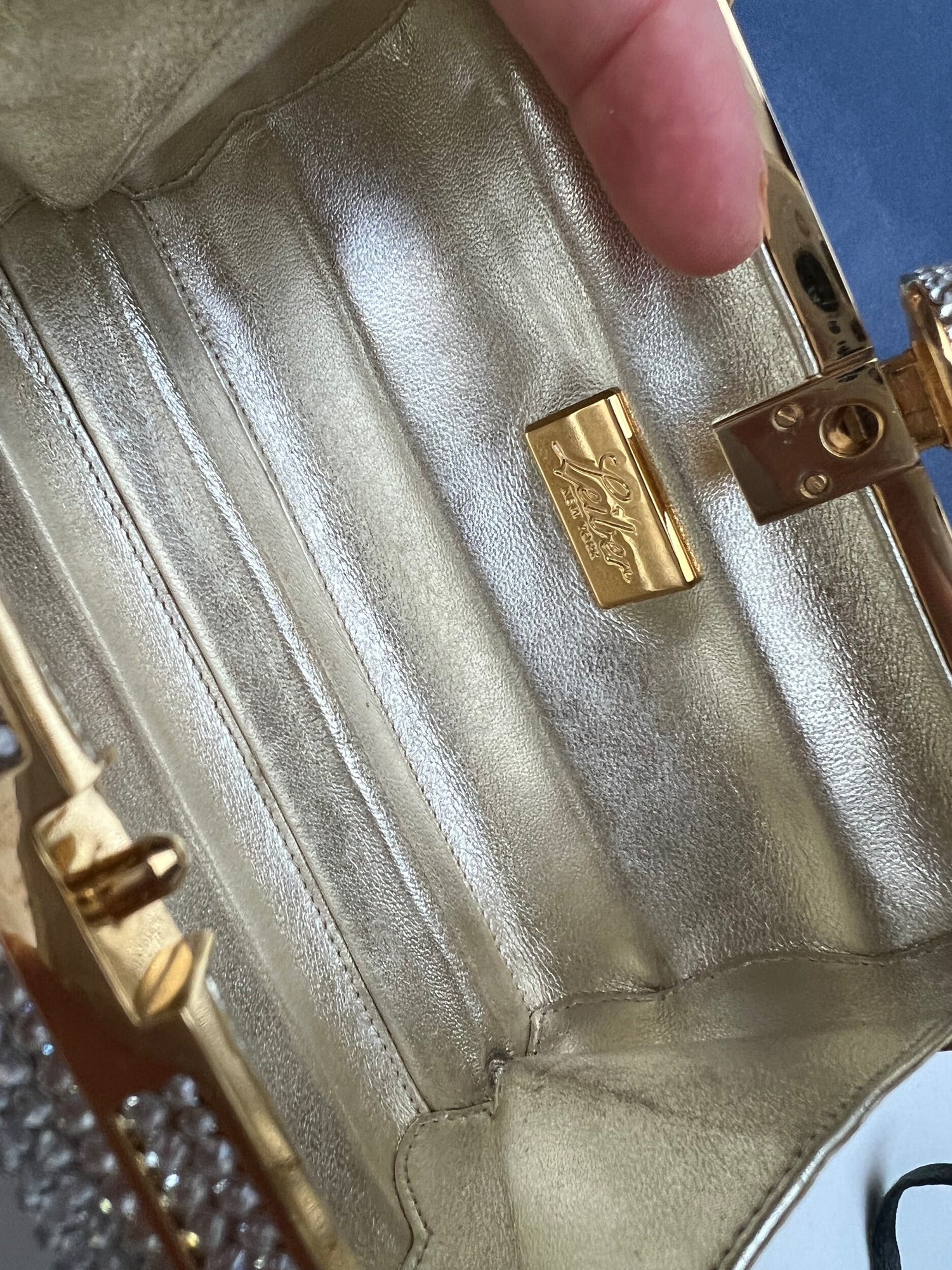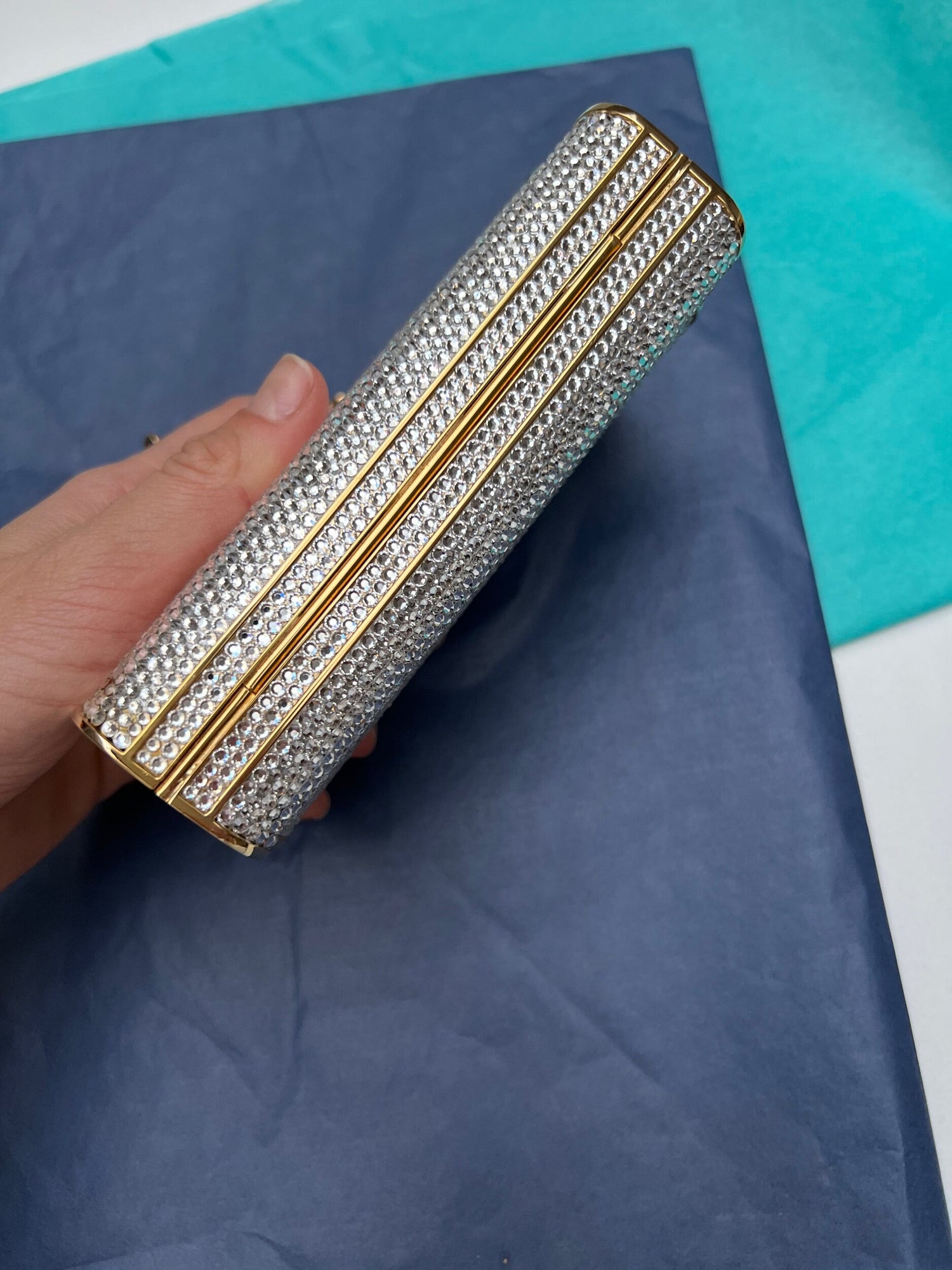 Color: silver crystals and gold hardware.