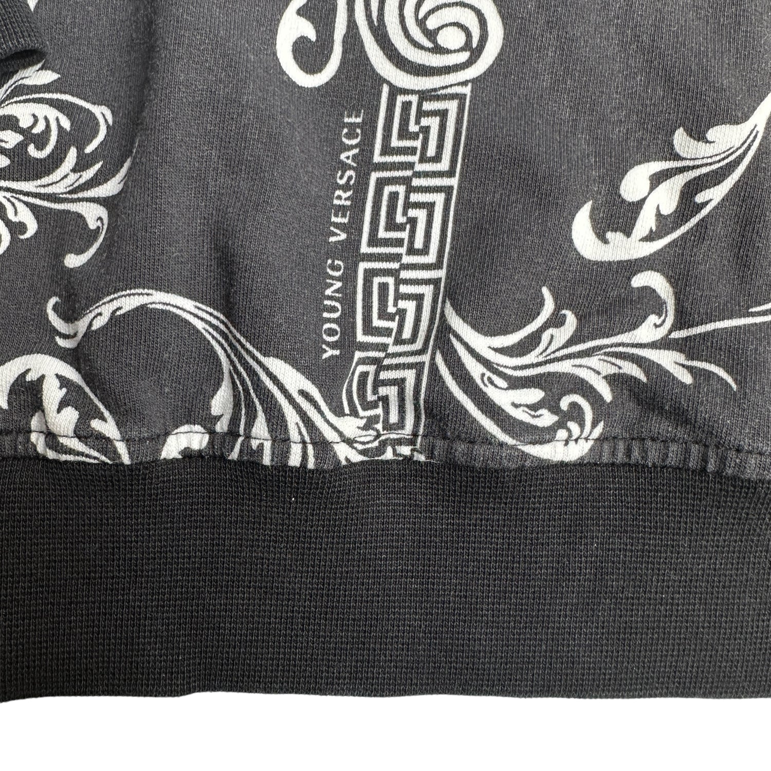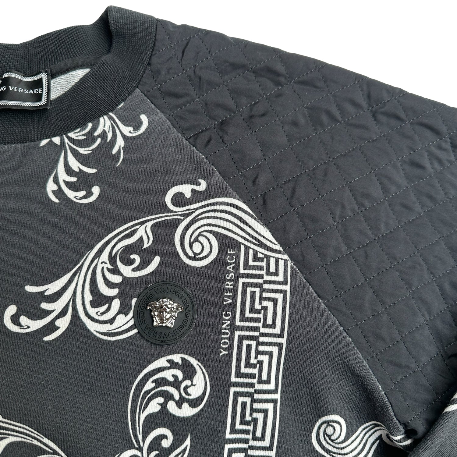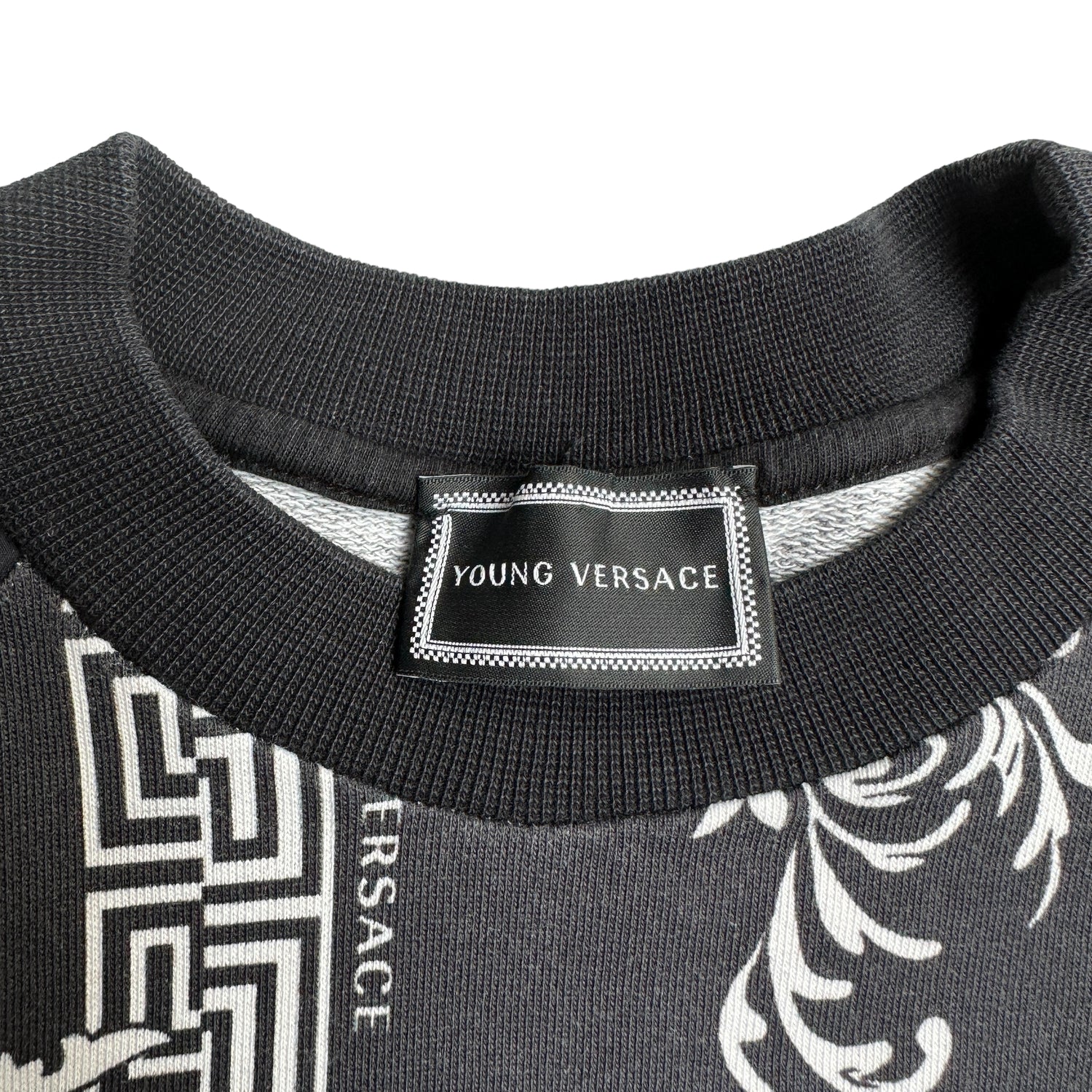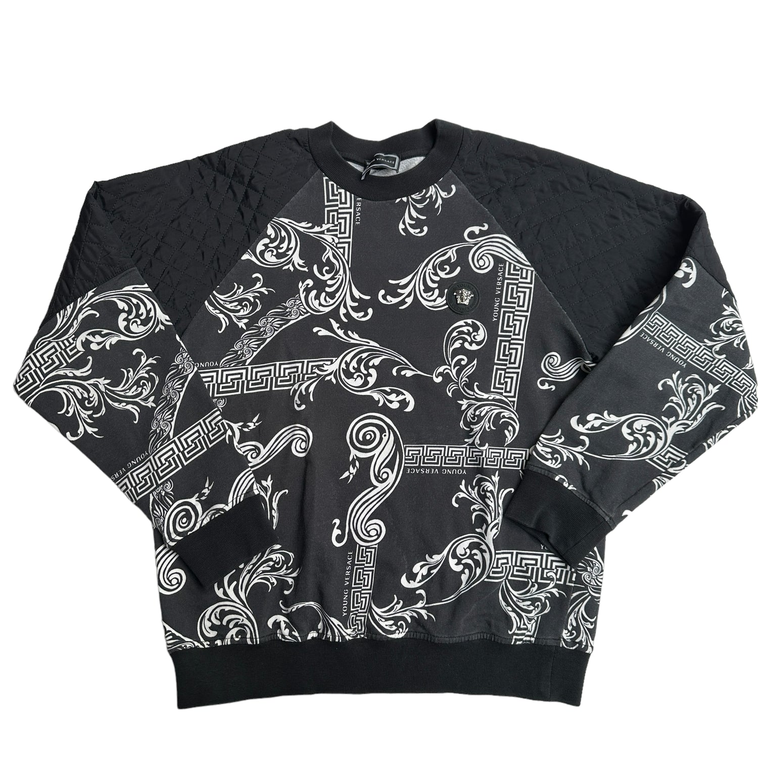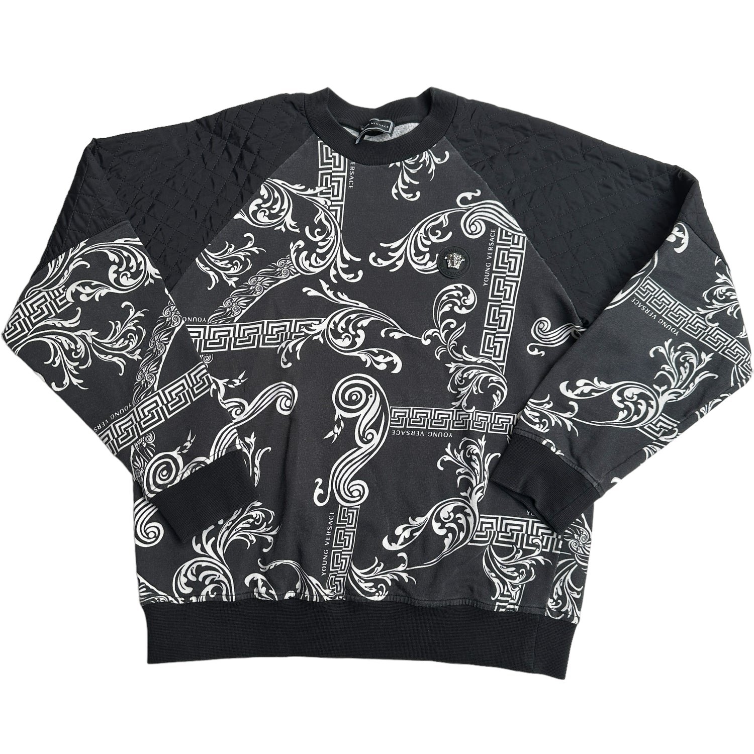 Versace unisex kid's sweater. Black and white. Versace logo at front. Young Versace logo throughout. Round neck. Quilted details at shoulders.