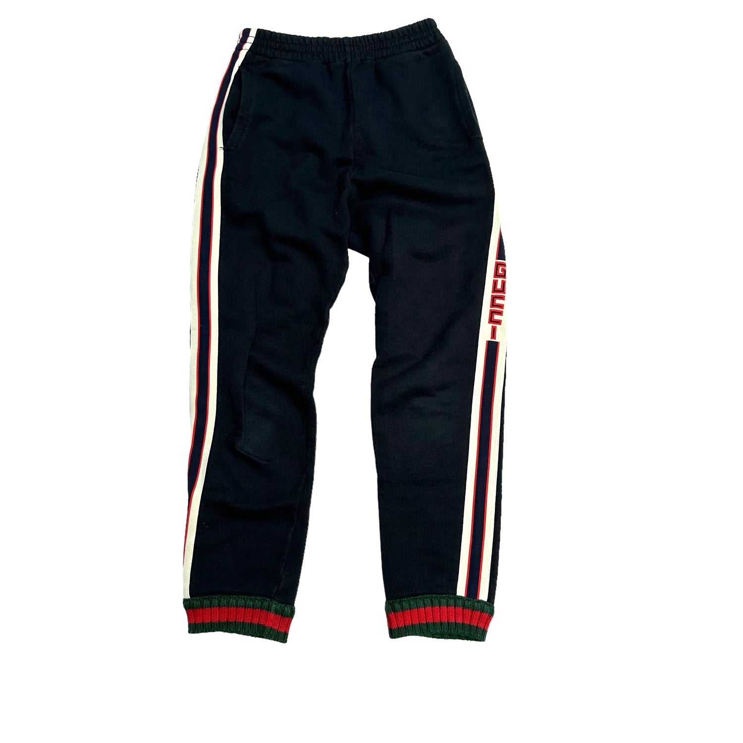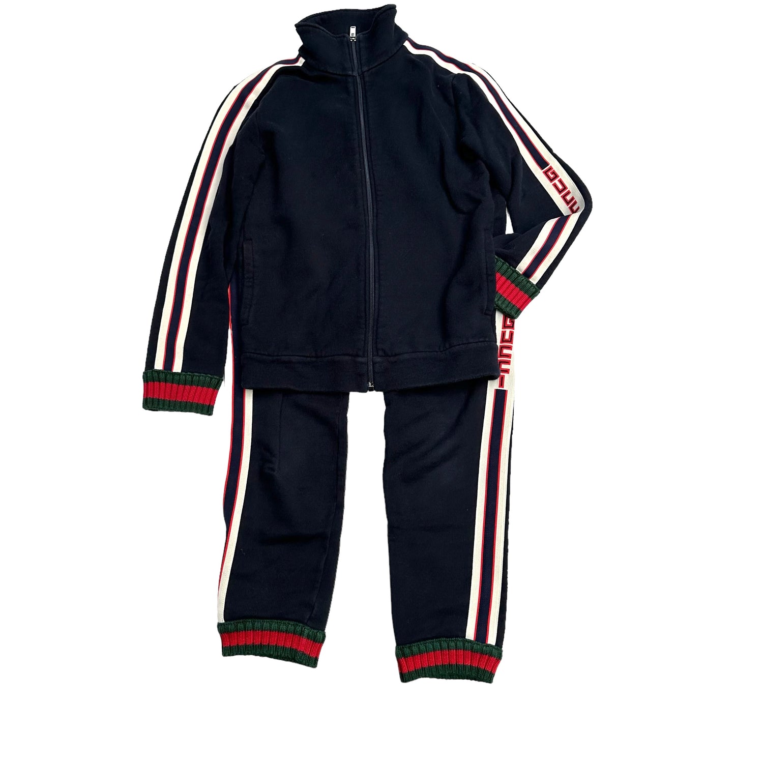 Gucci Unisex kid's sweat sweat set. Navy blue with Gucci logo red and white stripes. Zipper closure at sweater. Designer size 10 years old.
