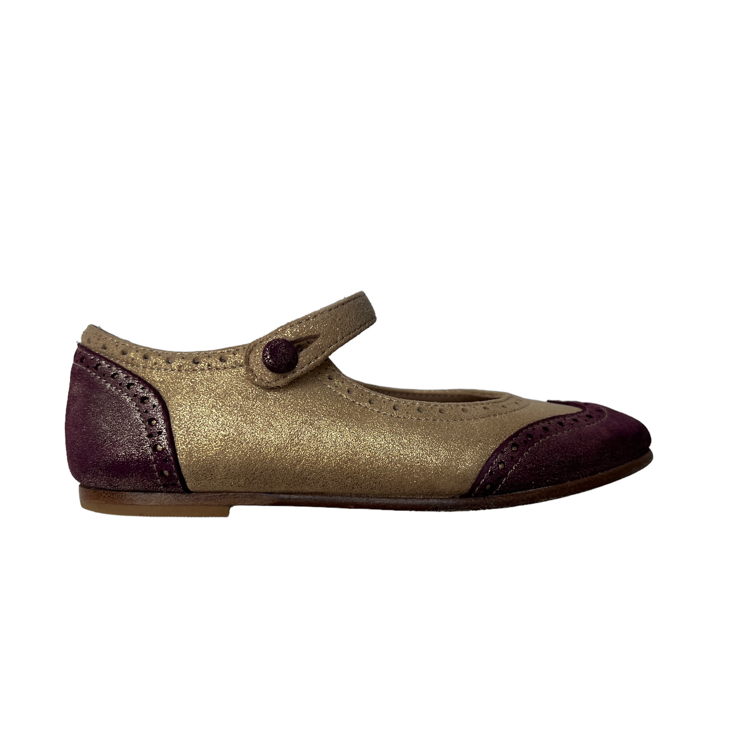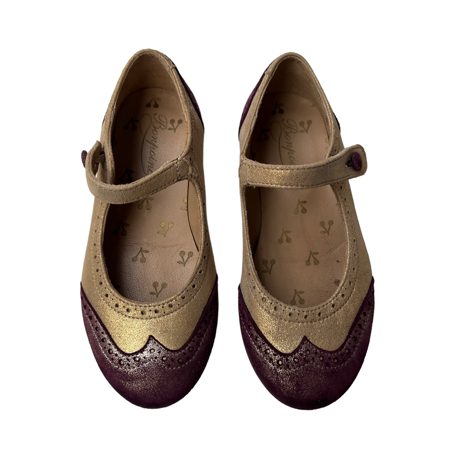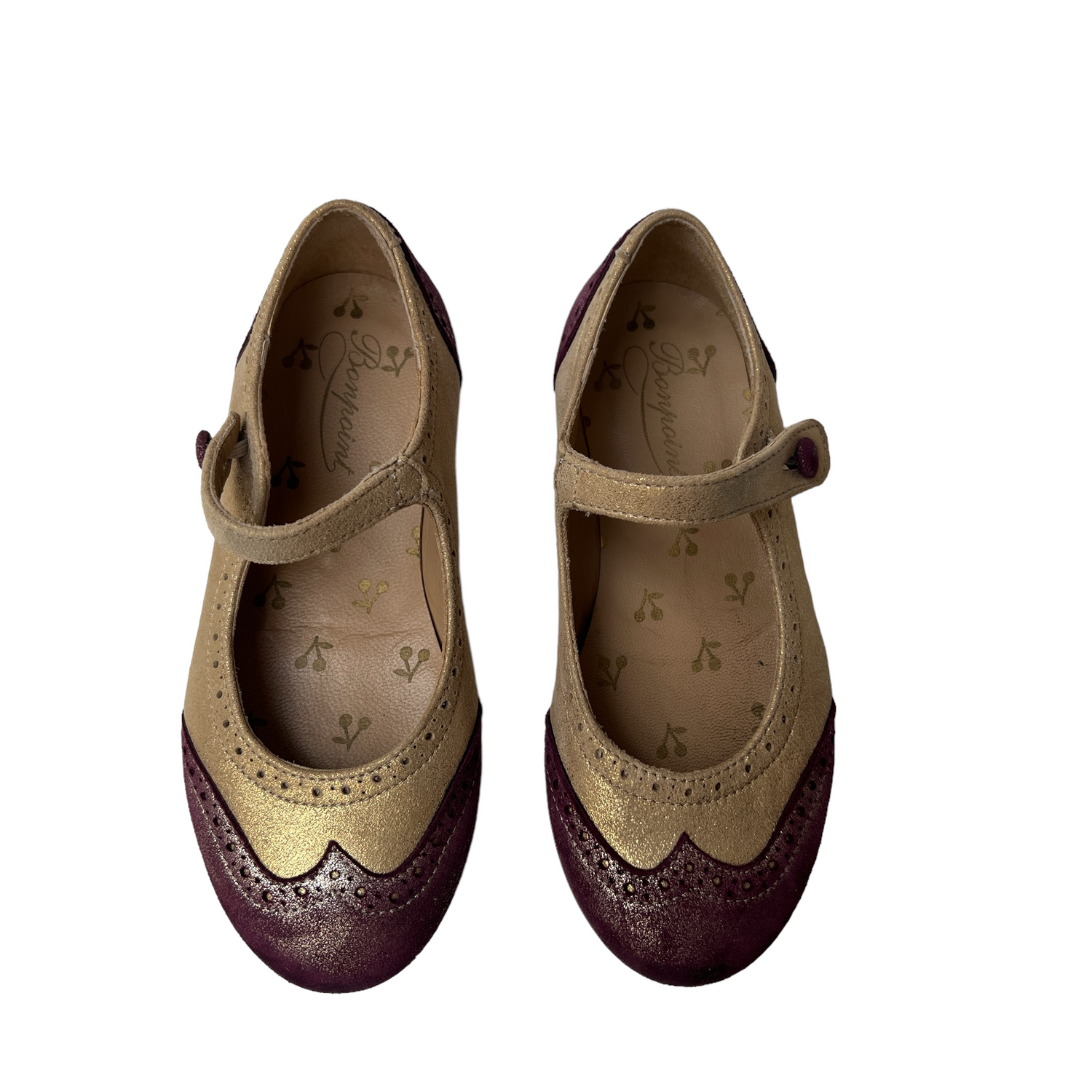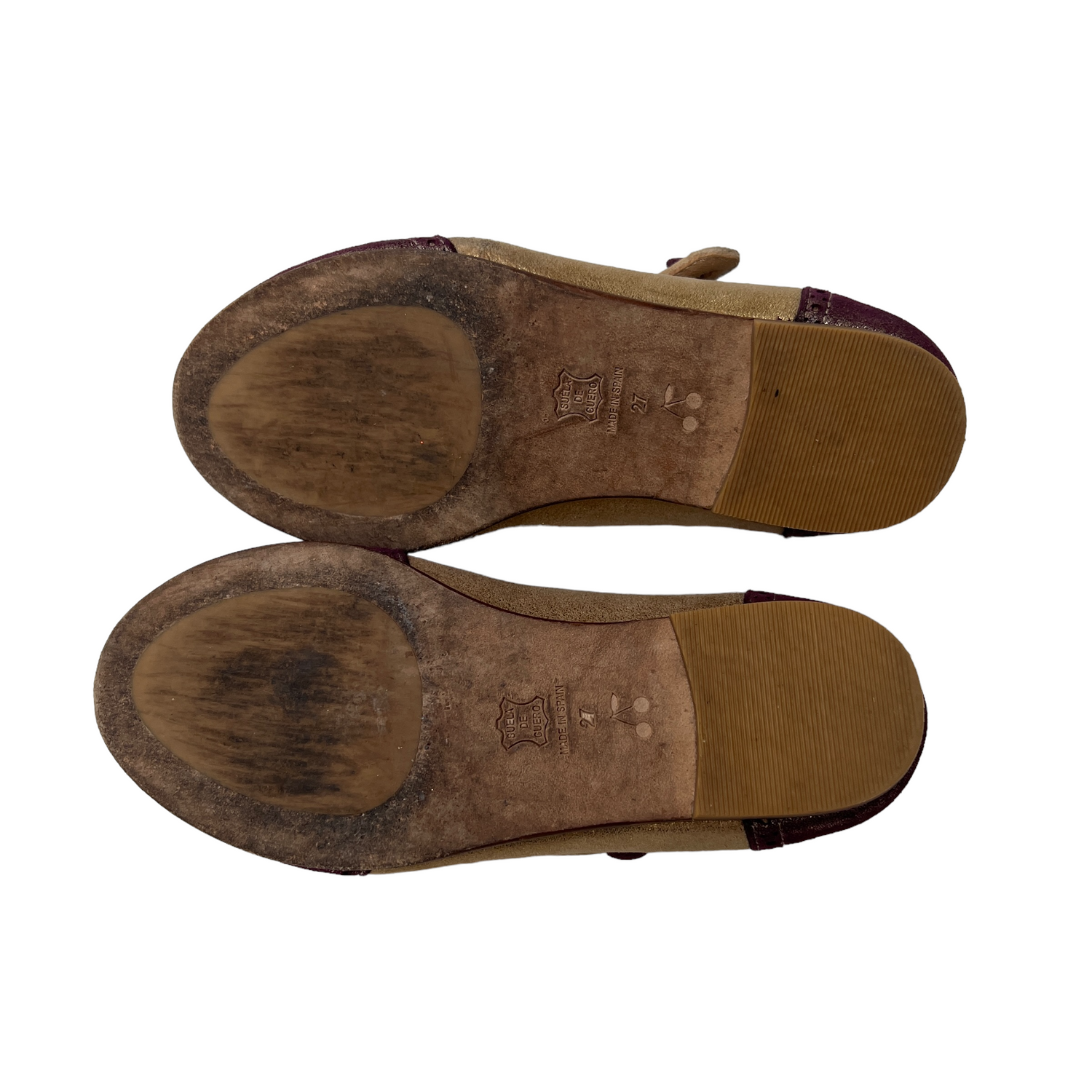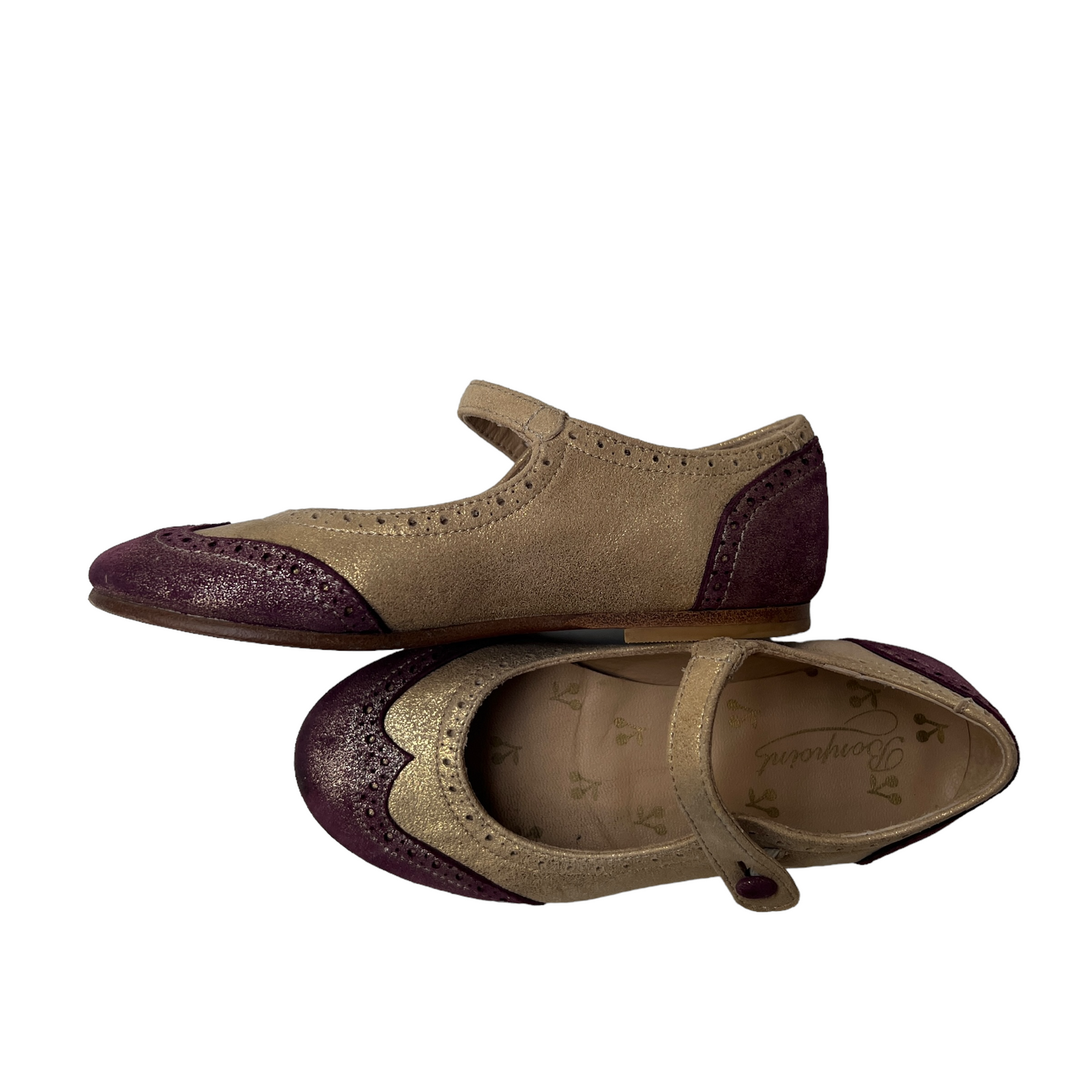 Bonpoint beige and purple Mary-Jane kids girls shoes. Button closure at side. Size 27 (EU).