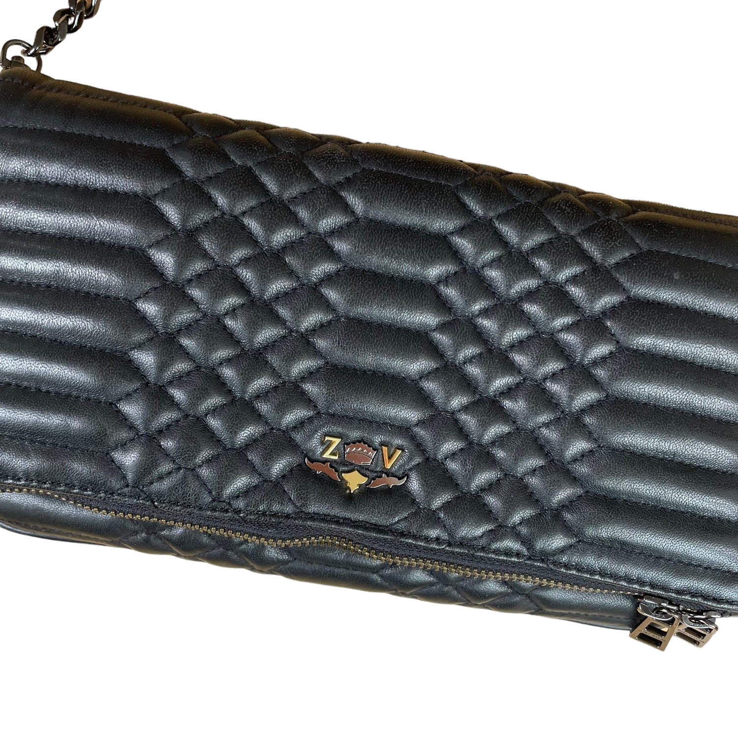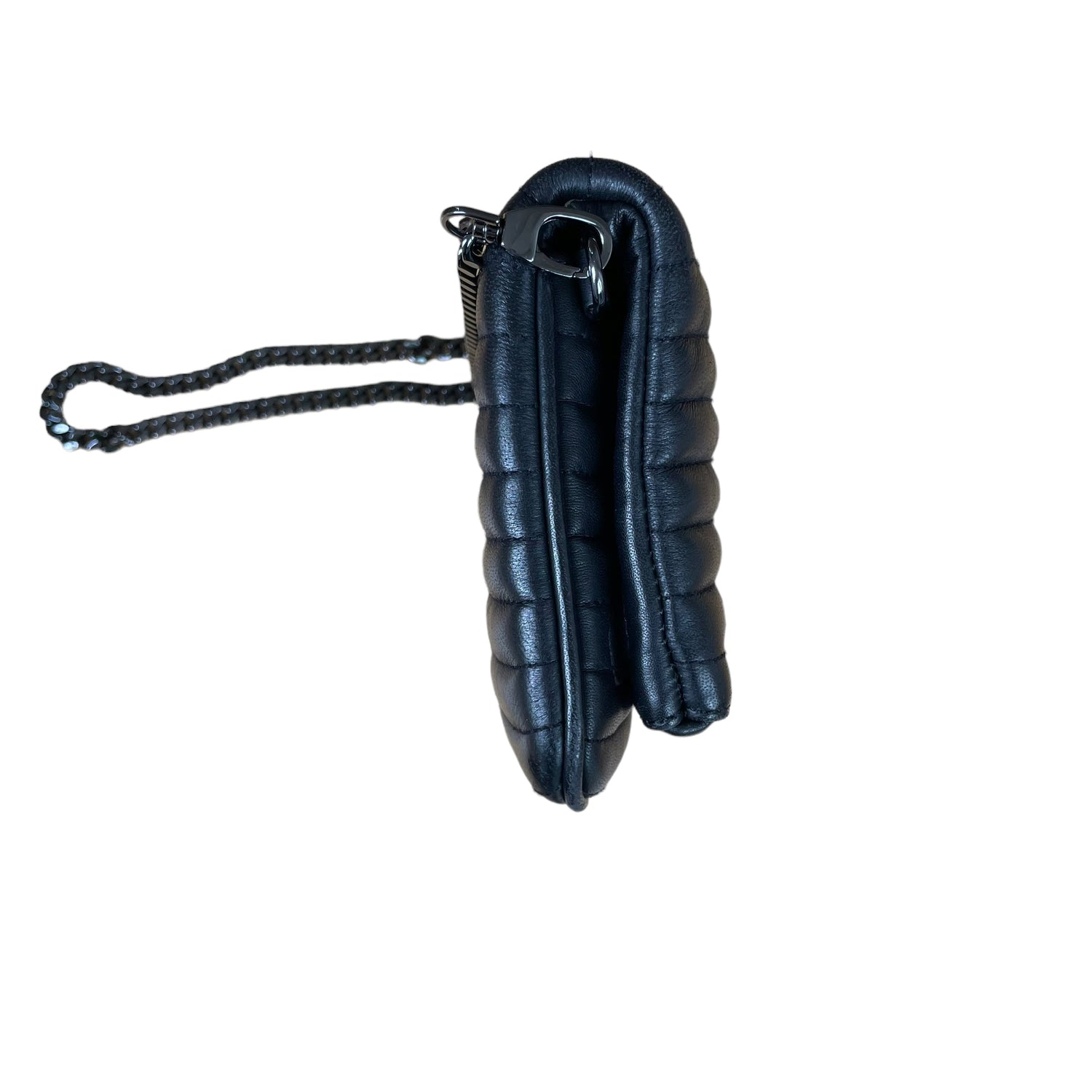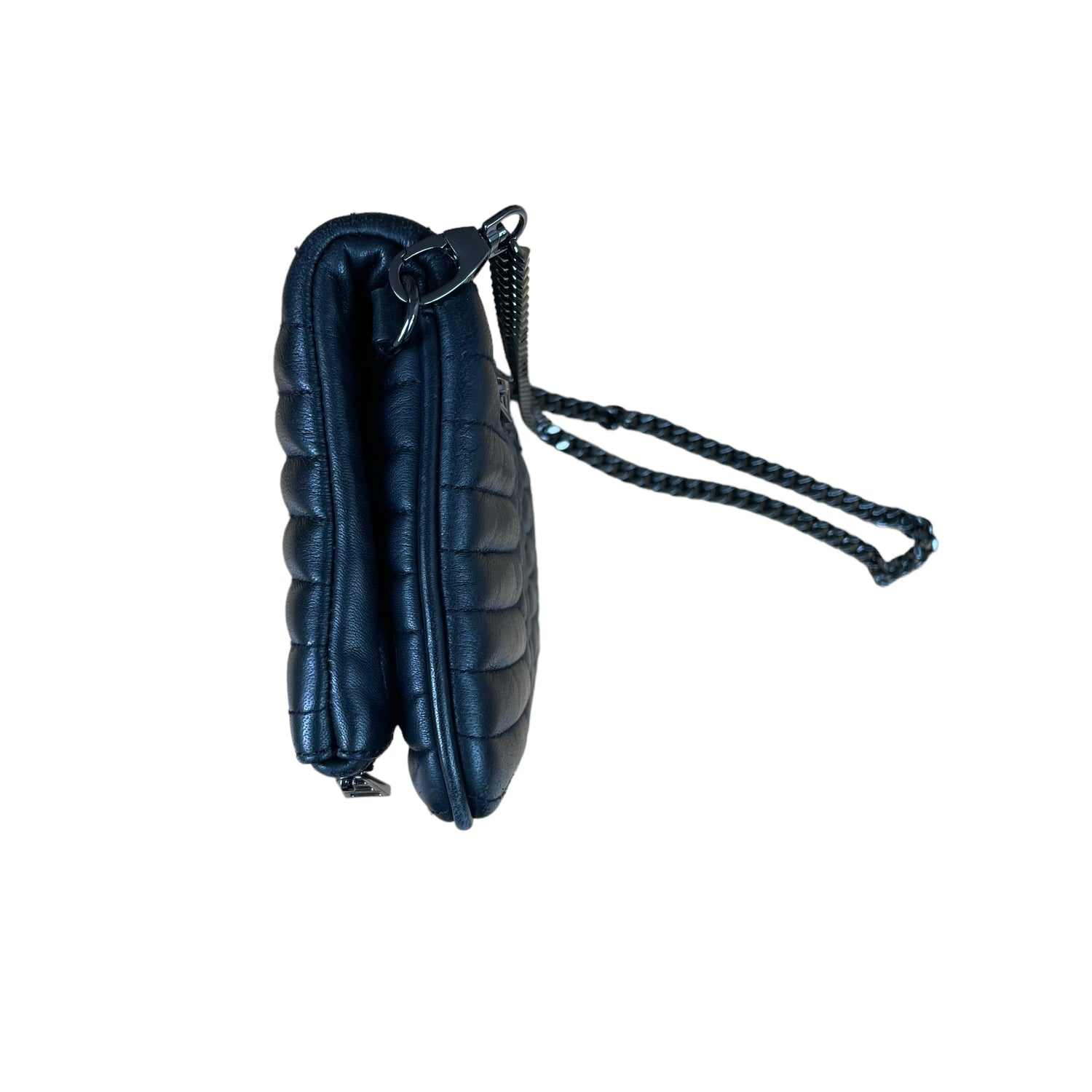 Zadig & Voltaire leather quilted clutch. Front flap with concealed magnet closures at main pocket. Zipper pocket at flap and back. Slit pocket inside flap. Dark chain strap and hardware. Logo at front.