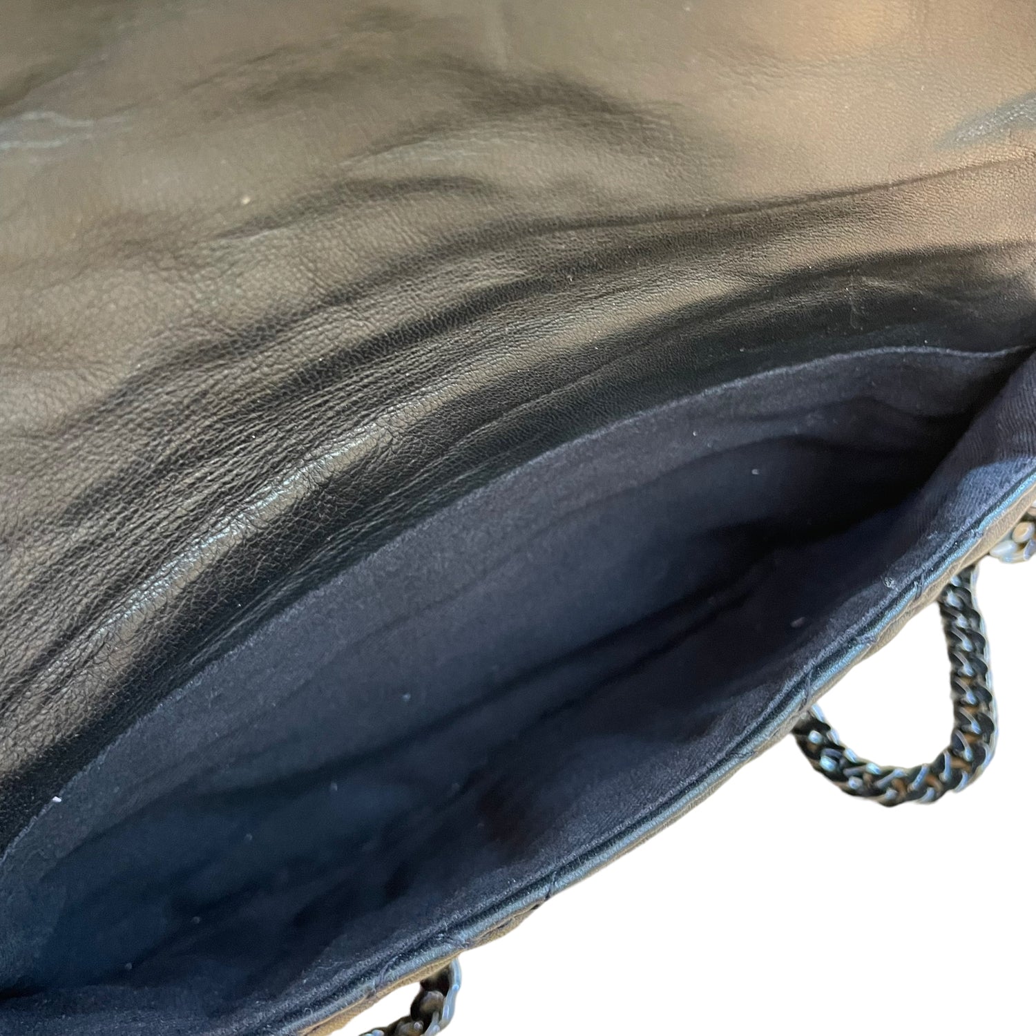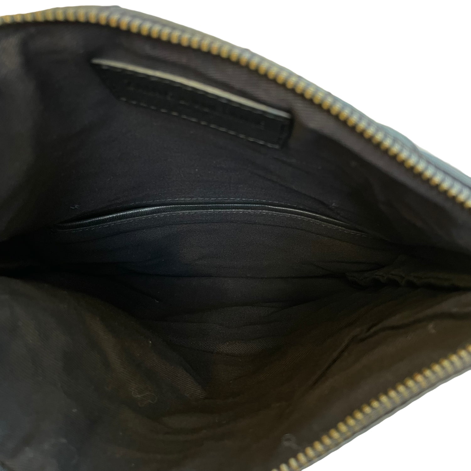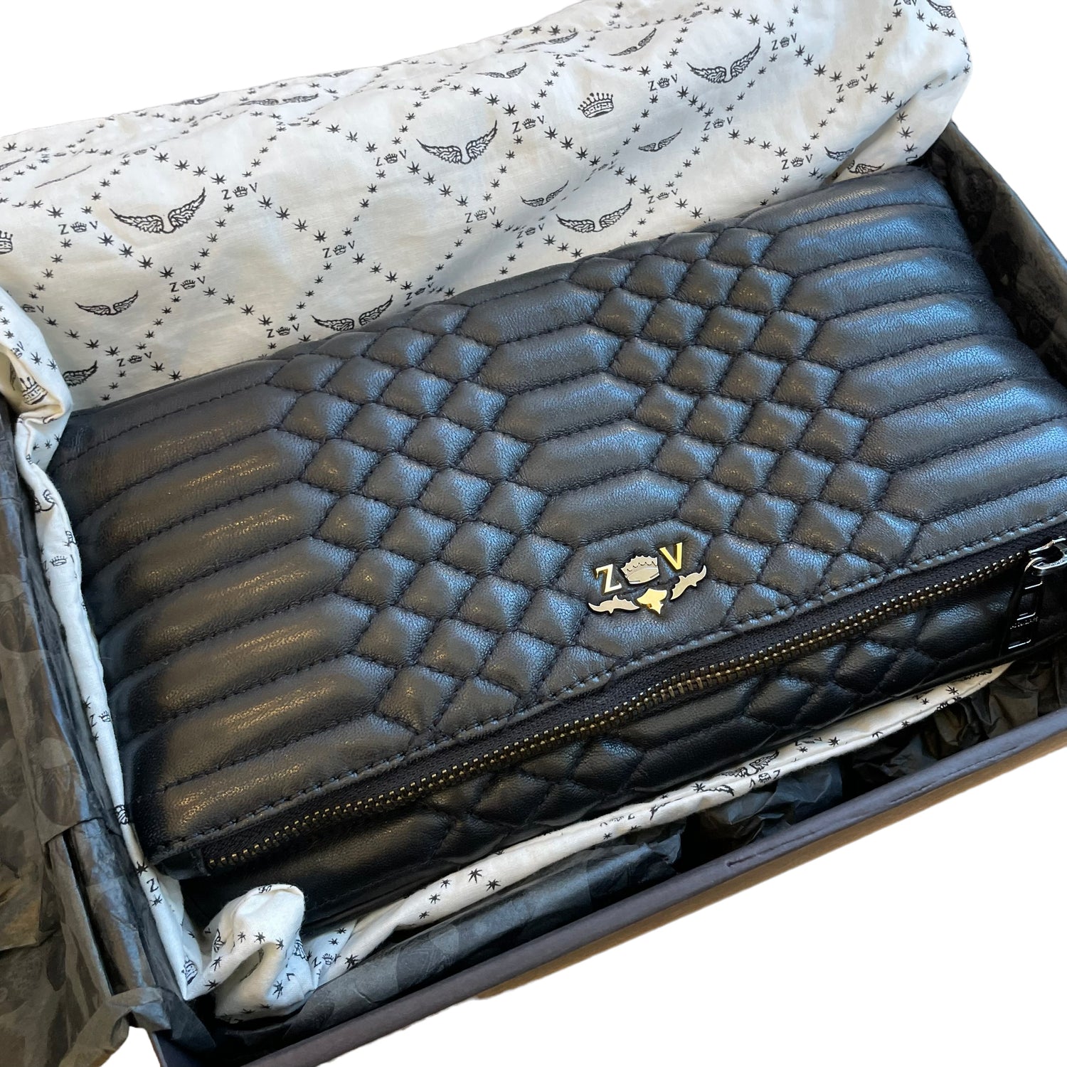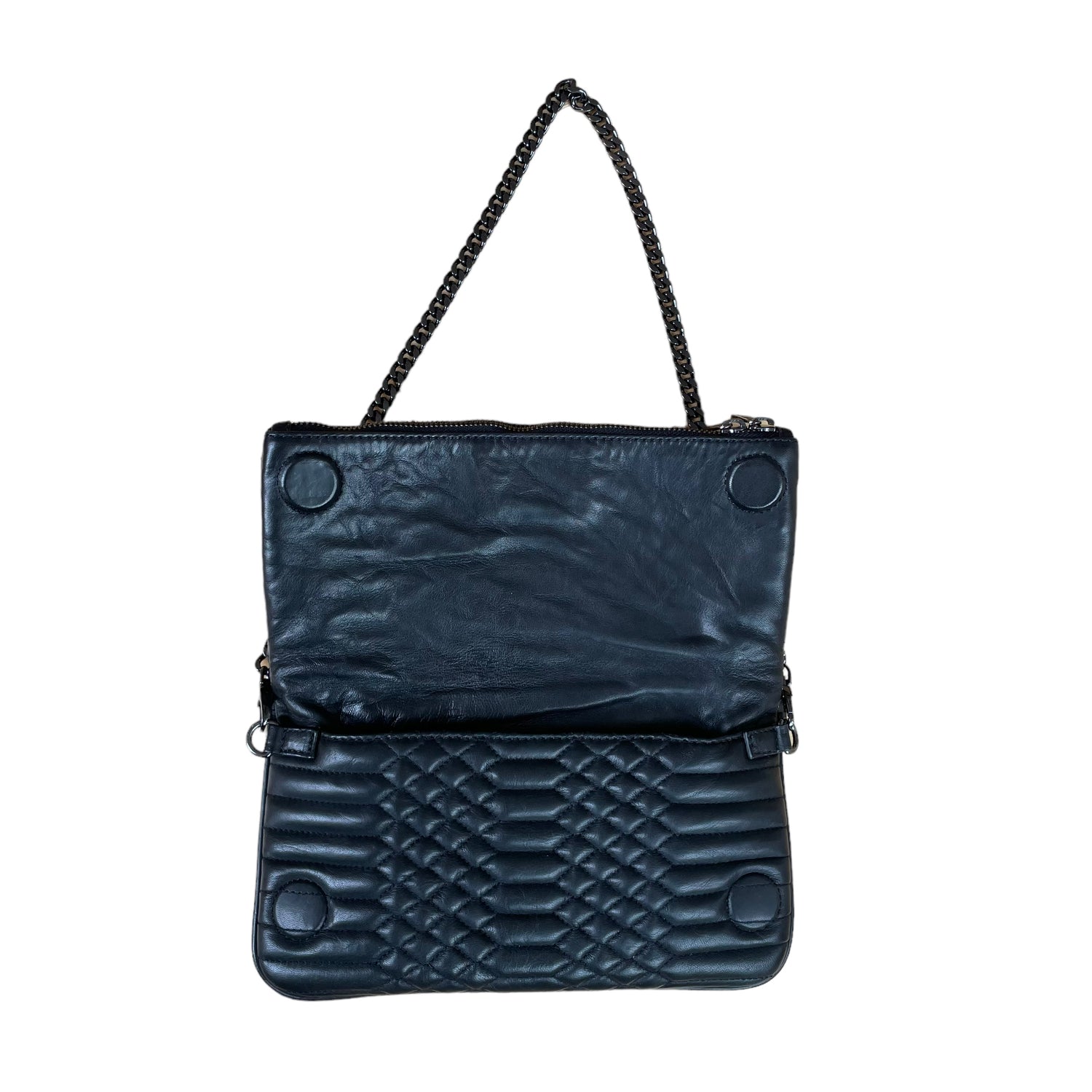 Zadig & Voltaire leather quilted clutch. Front flap with concealed magnet closures at main pocket. Zipper pocket at flap and back. Slit pocket inside flap. Dark chain strap and hardware. Logo at front.