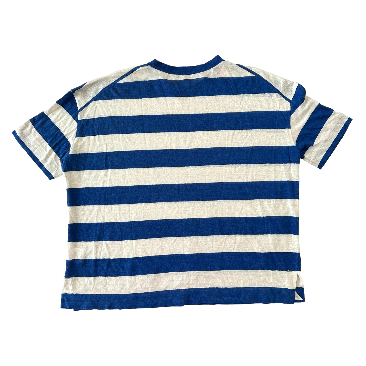 Loro Piana linen striped T-shirt. Blue and beige colors. Round neck. Oversized fit. Short sleeves. Perfect with jeans or a white pair of shorts such as the one we have listed for a complete outfit. Designer size 40.