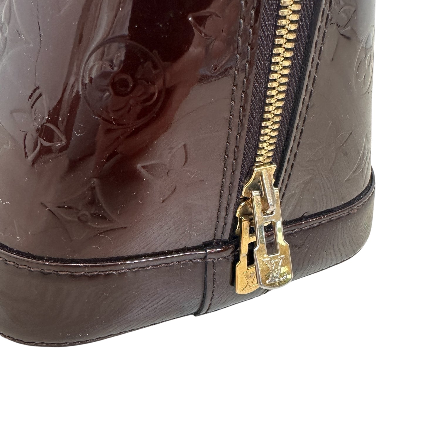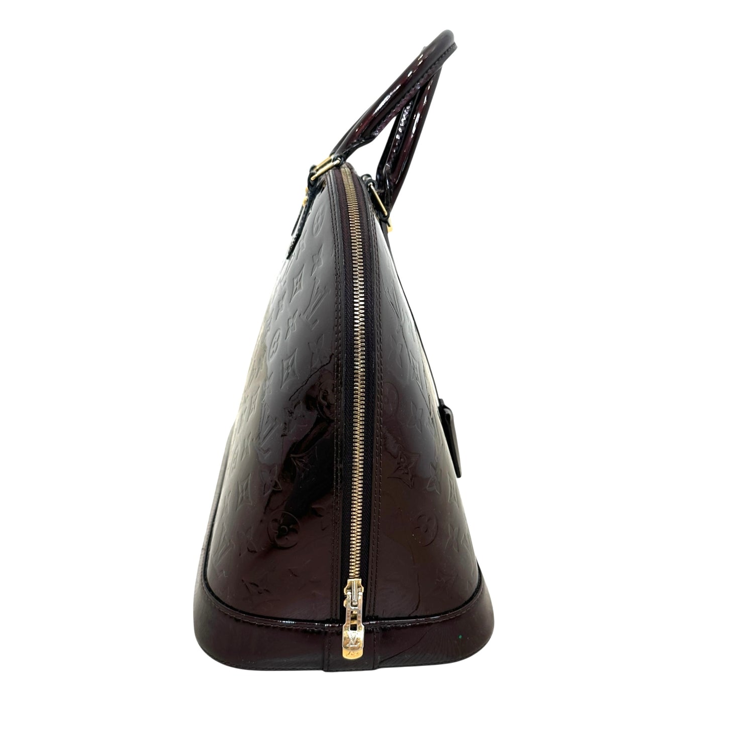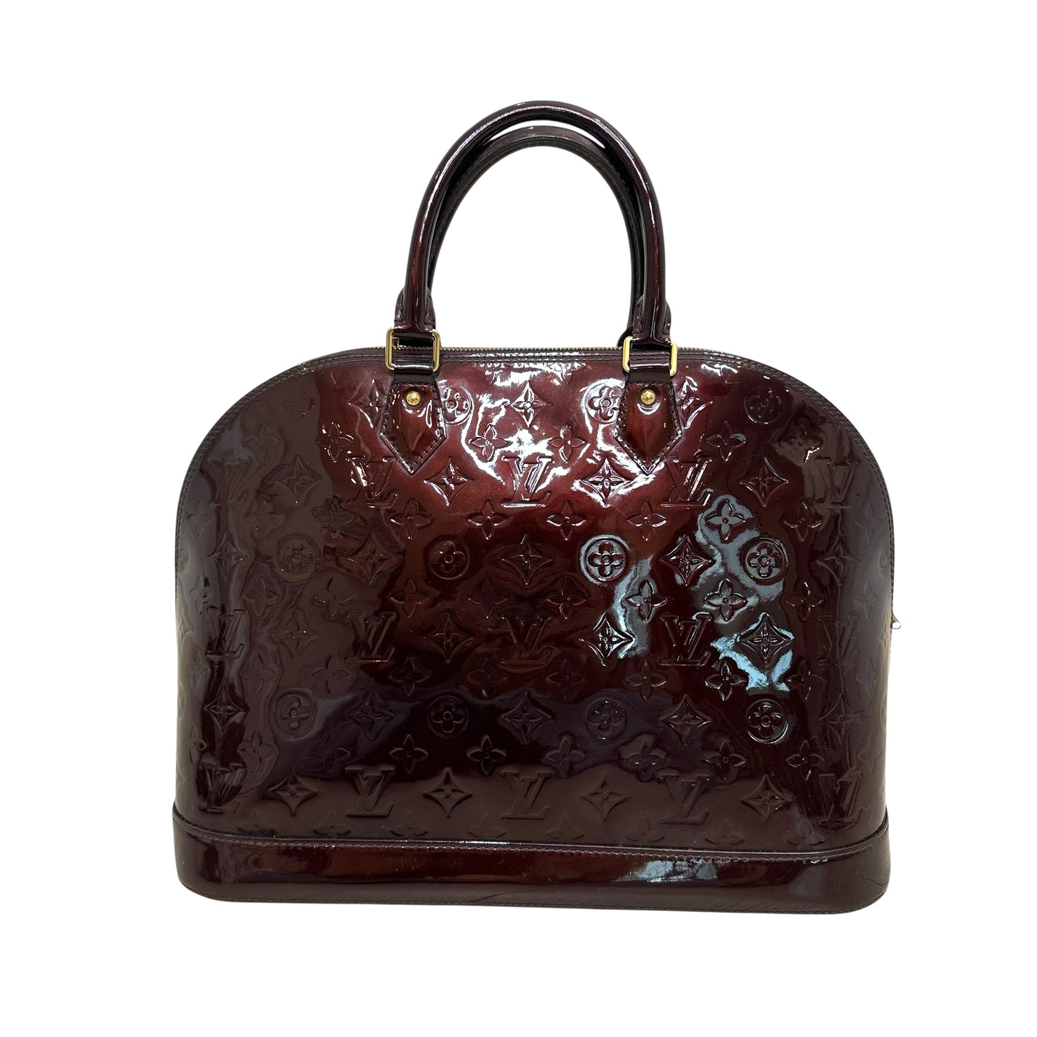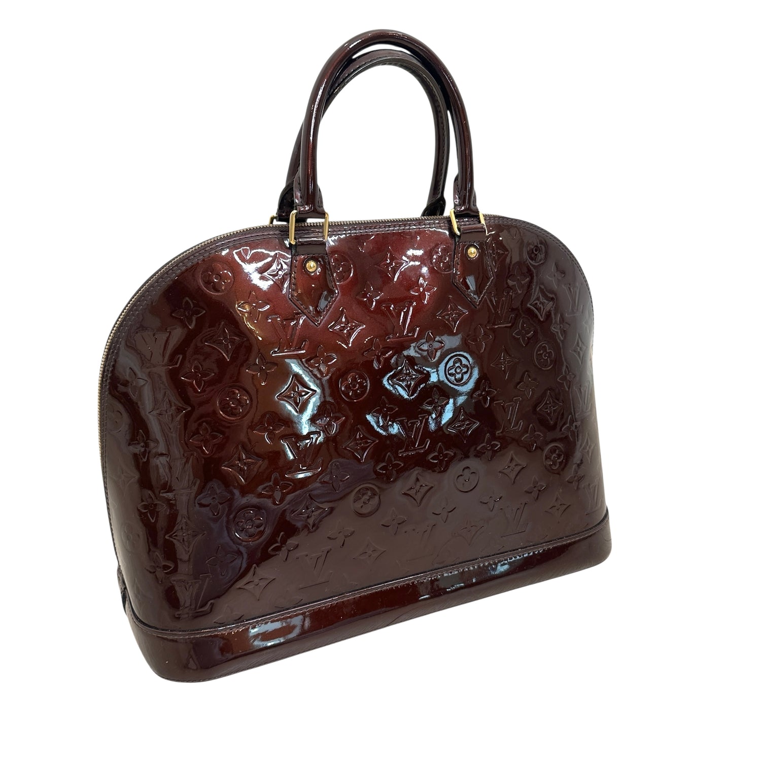 Louis Vuitton Alma bag. Dark burgundy monogram patent leather. Double rolled handles. Gold zipper closure.