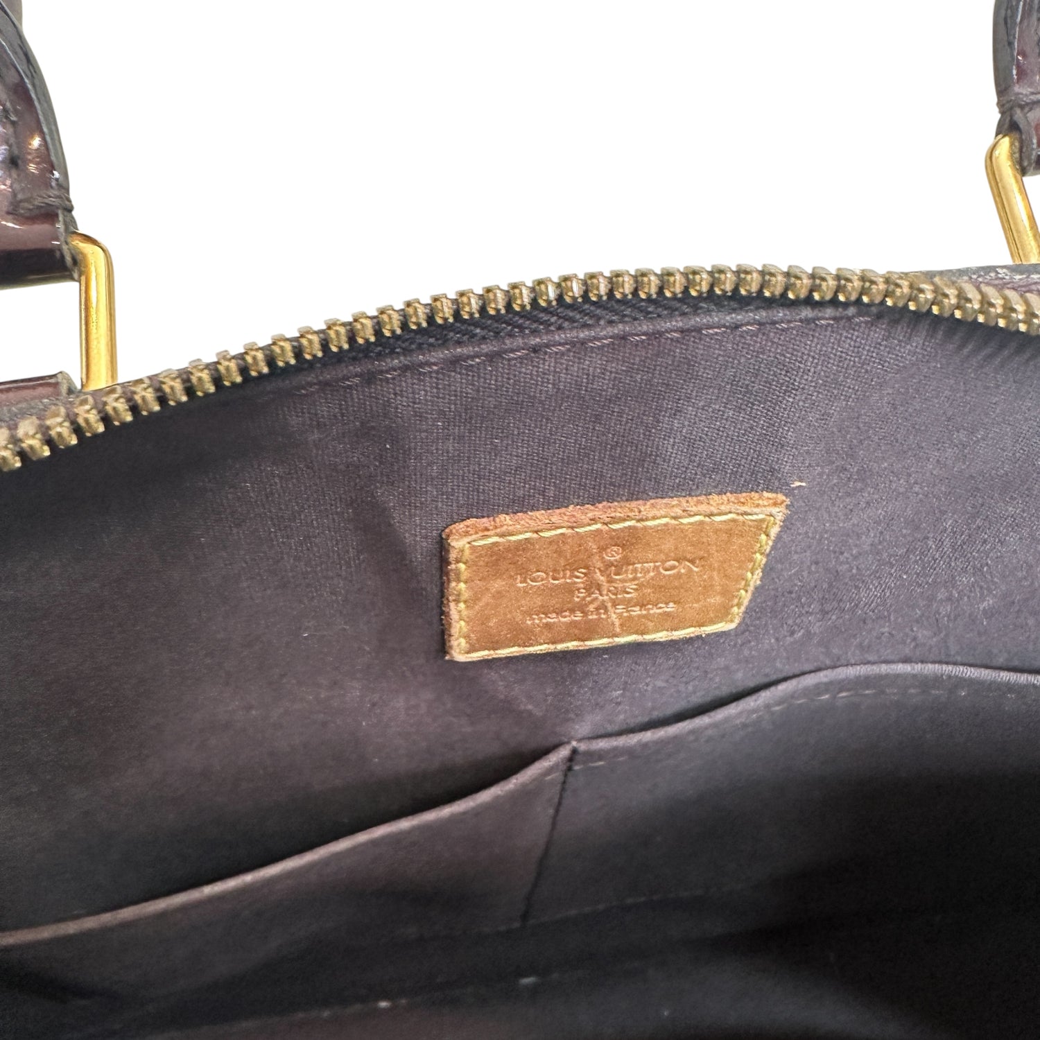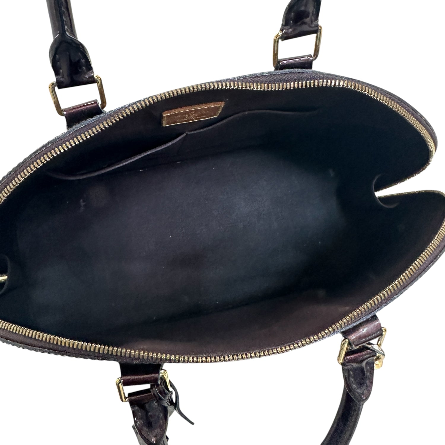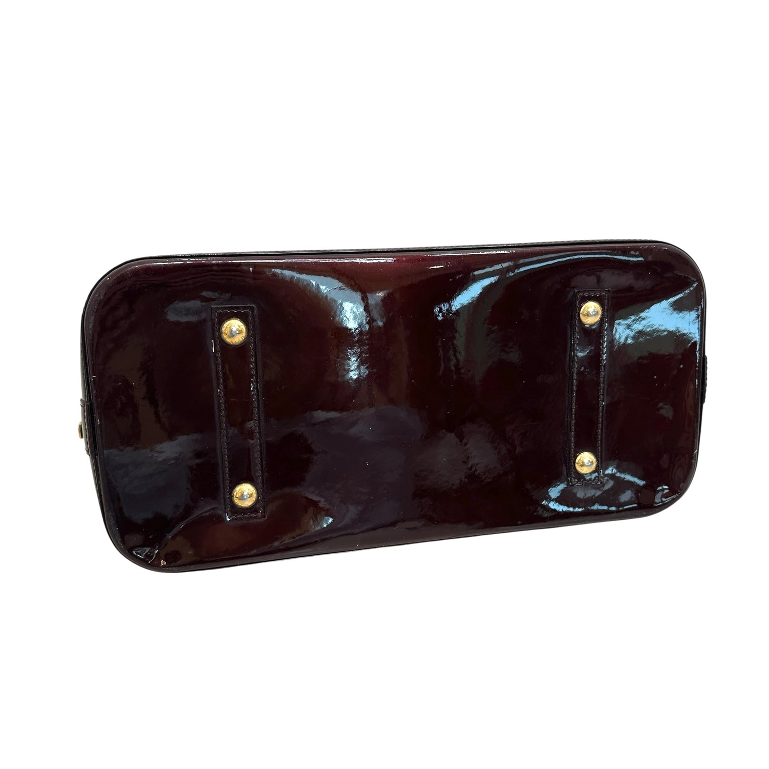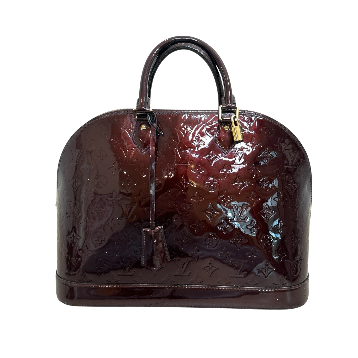 Louis Vuitton Alma bag. Dark burgundy monogram patent leather. Double rolled handles. Gold zipper closure.