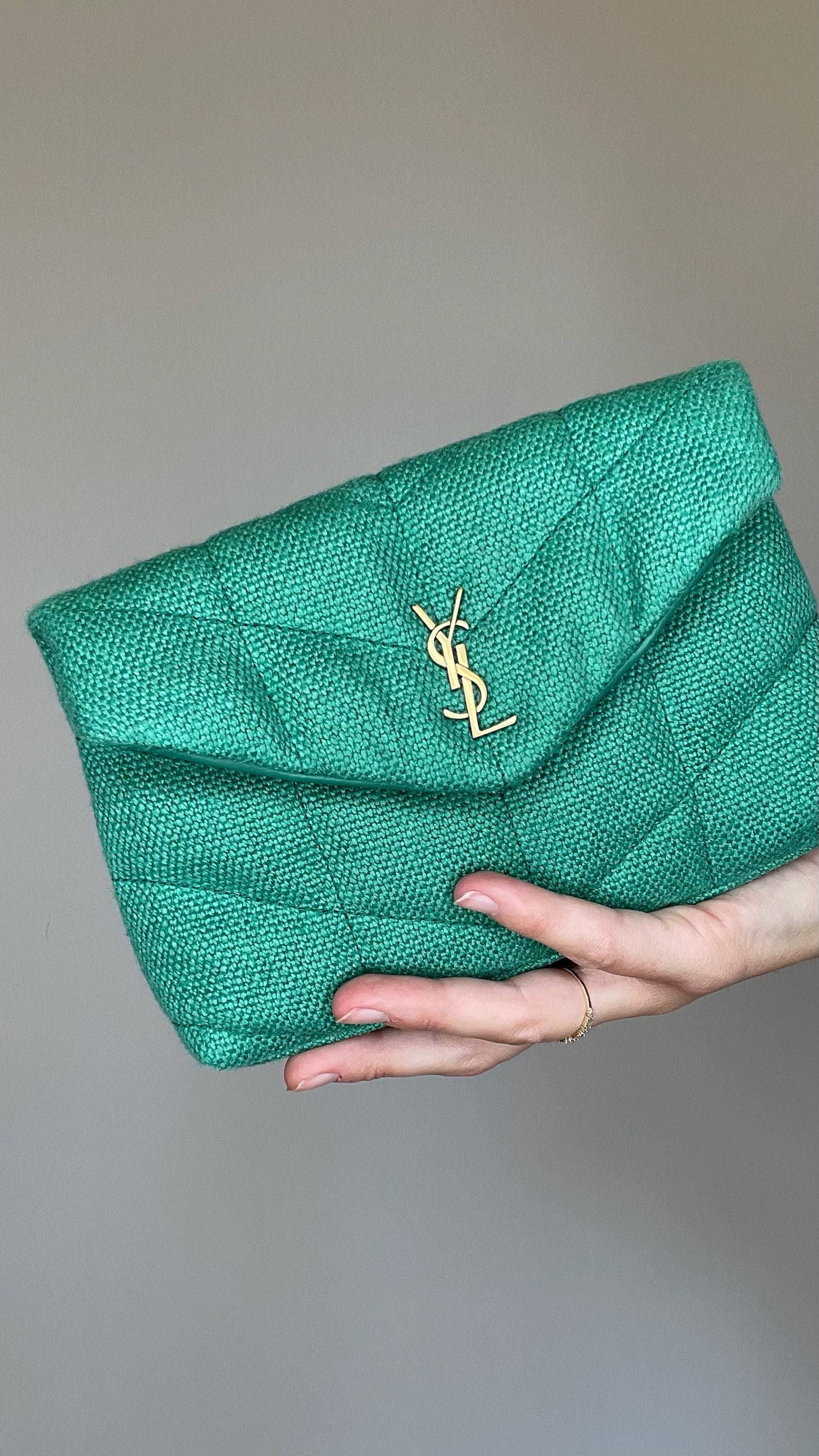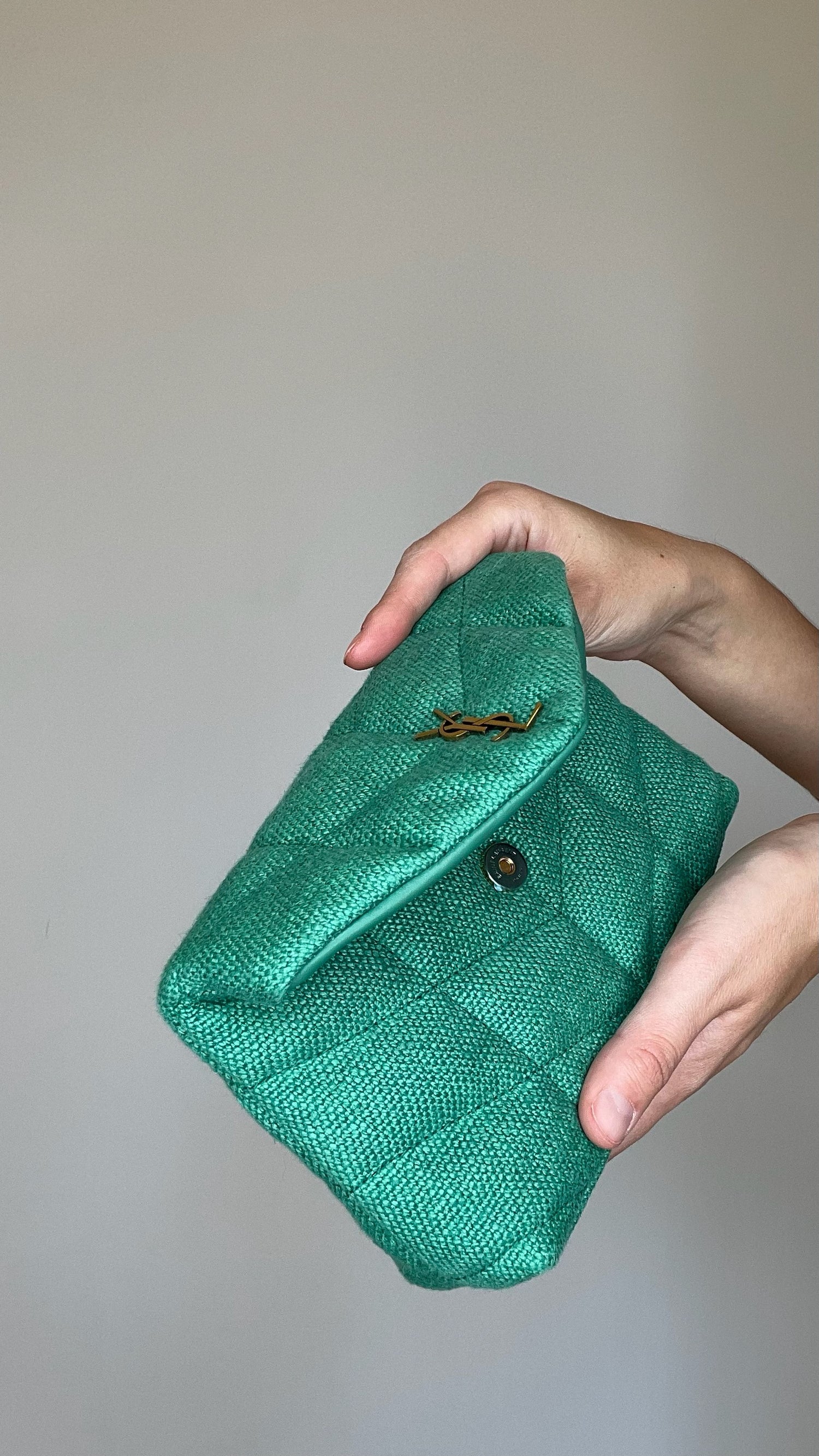 Saint Laurent Loulou clutch. Blue green canvas. YSL logo in gold-tone hardware. Magnetic snap closure at flap.