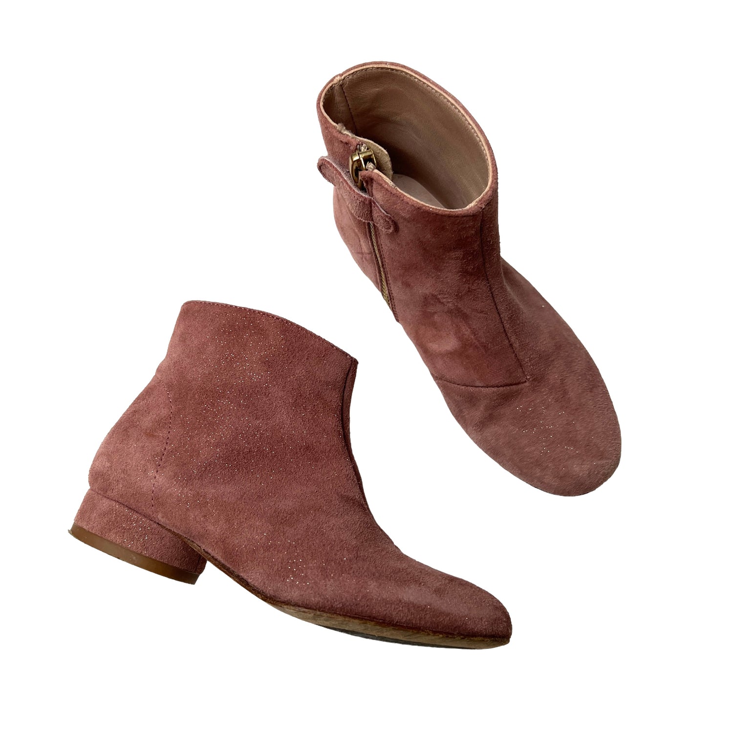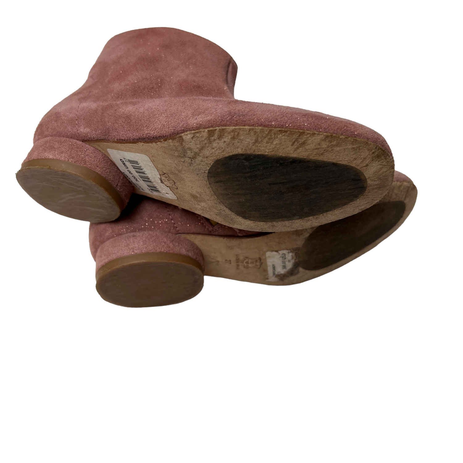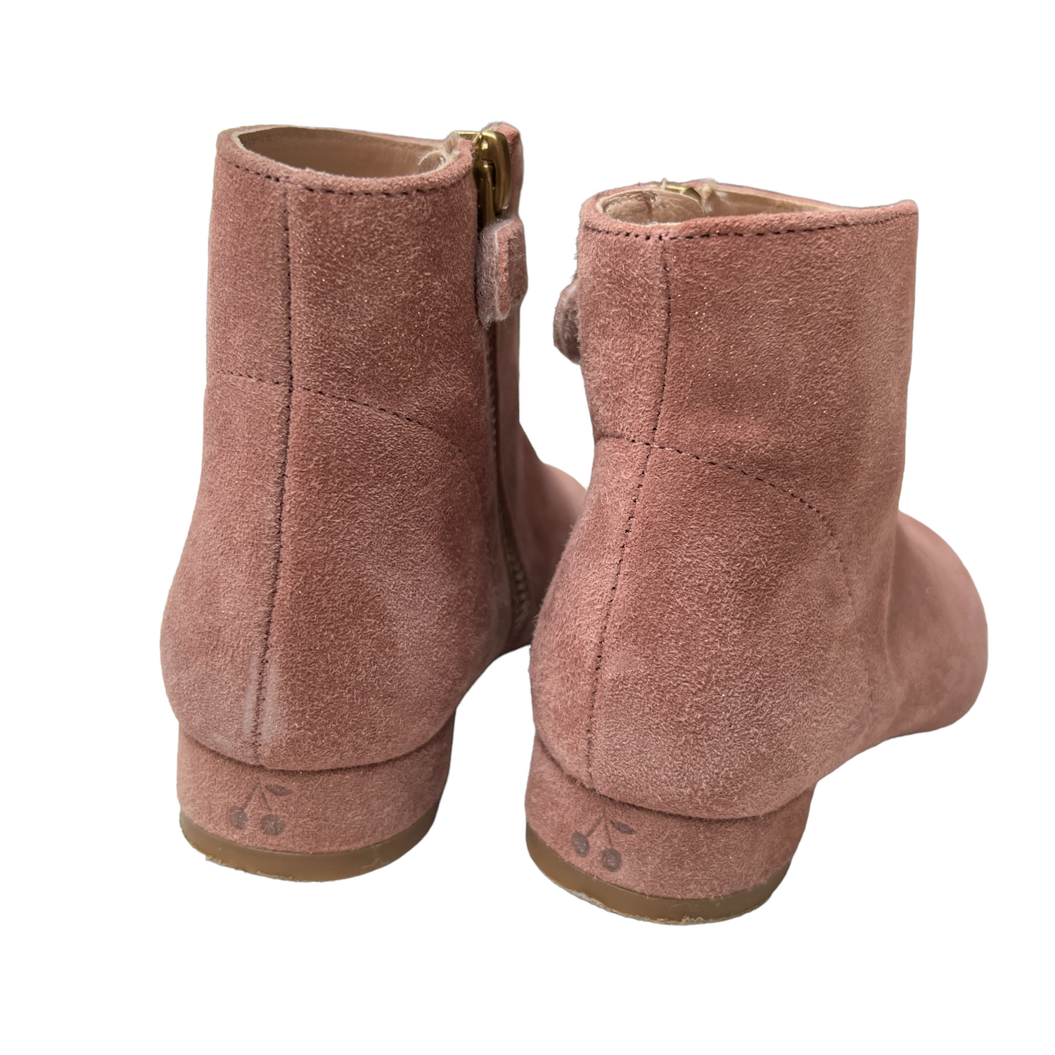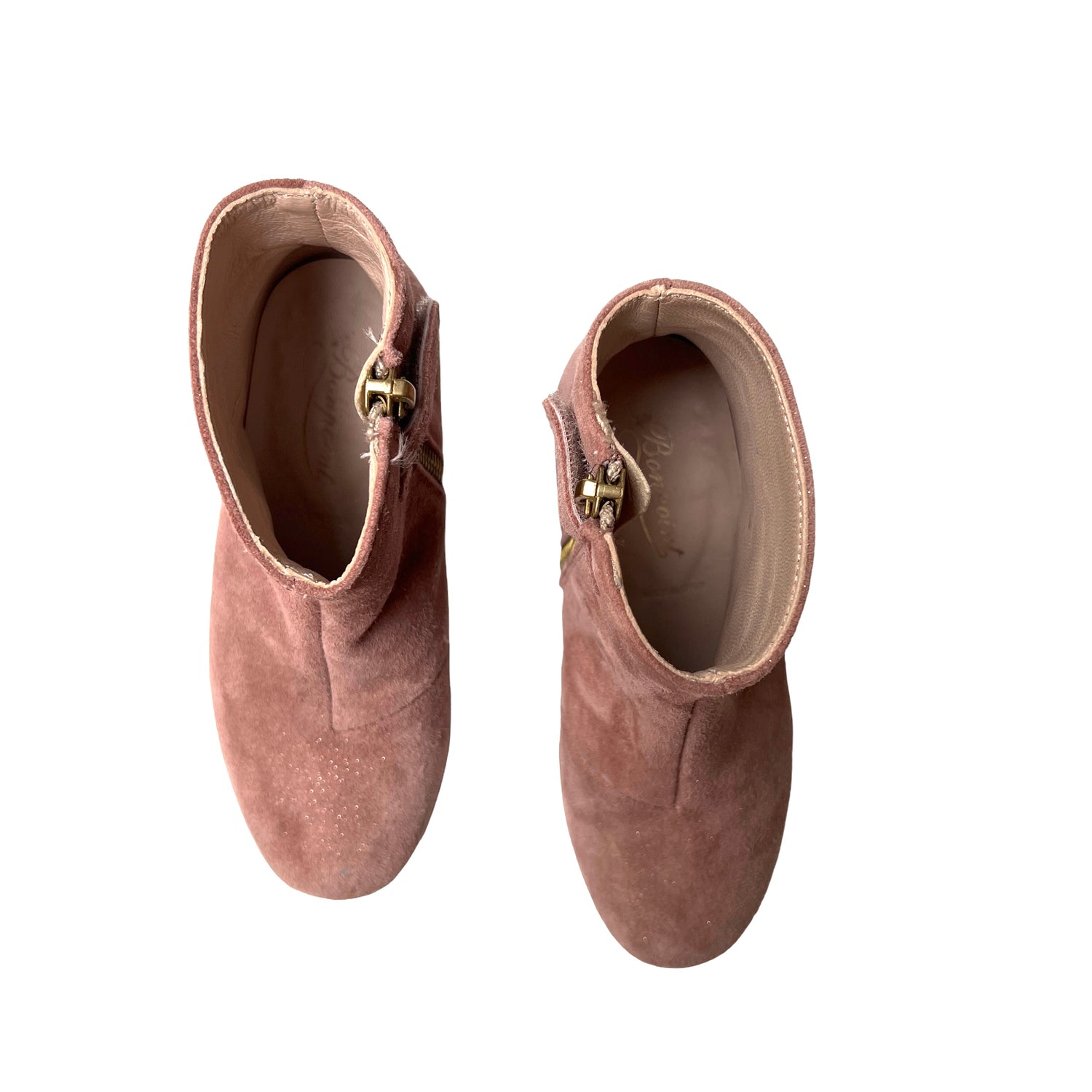 Bonpoint kids pink suede boots with gold shimmer. Zipper closure at side. Iconic cherry on heels. Designer size 27 (EU).
