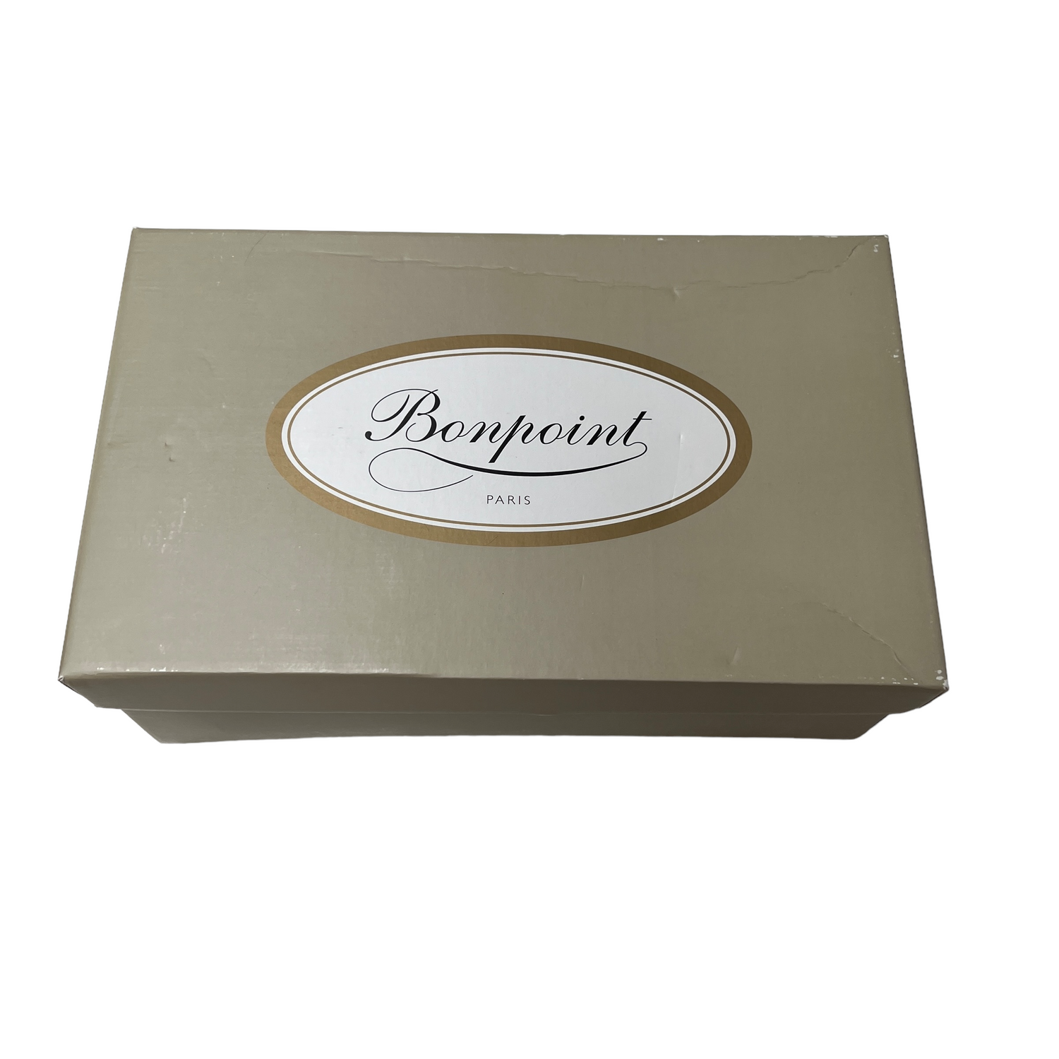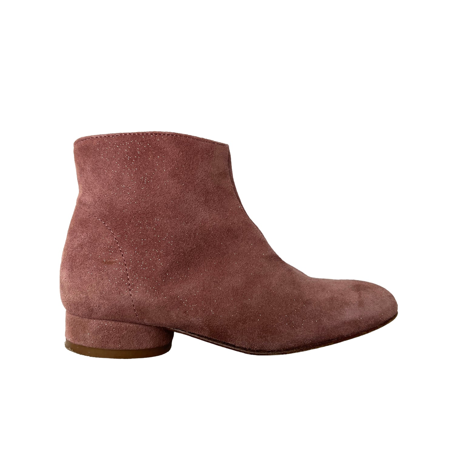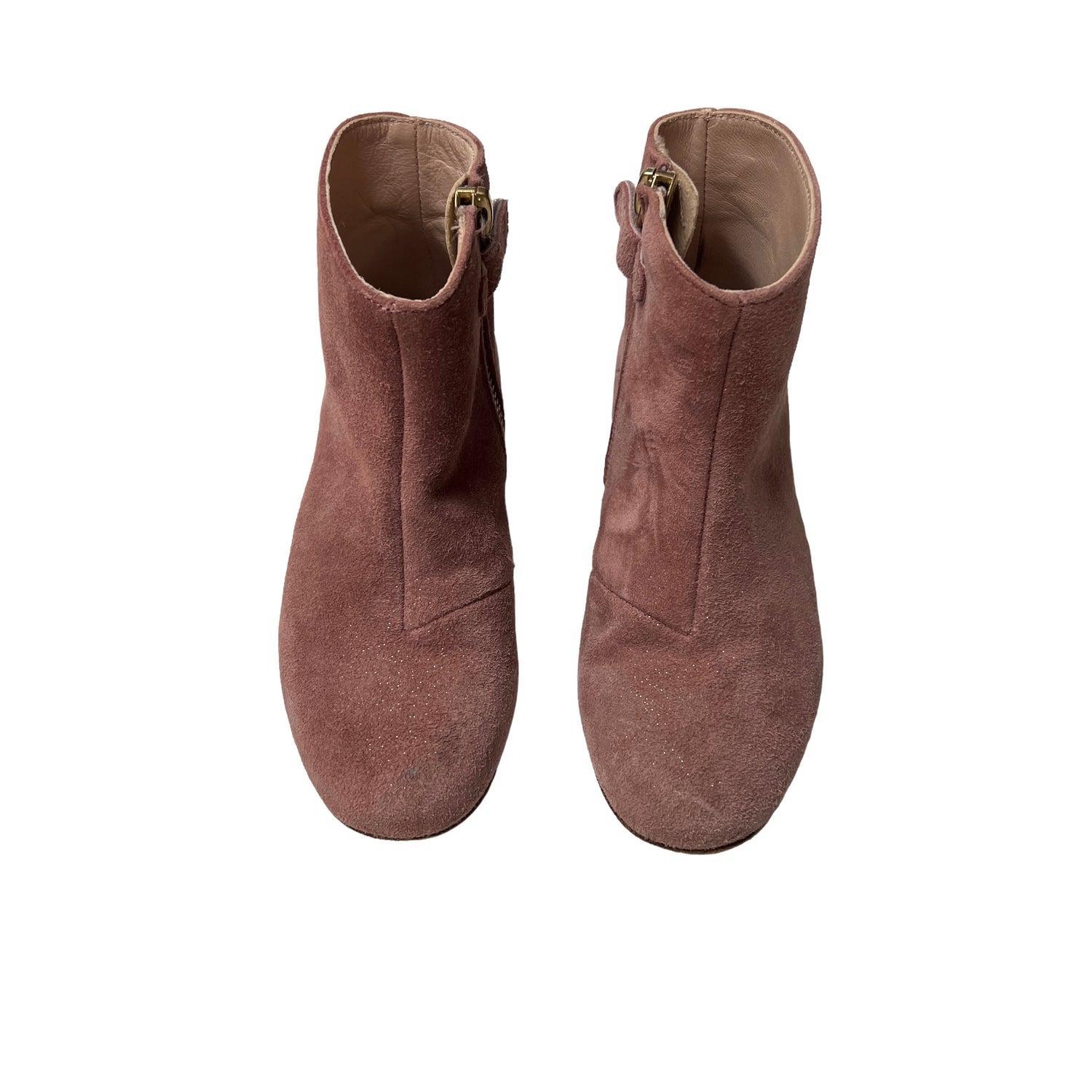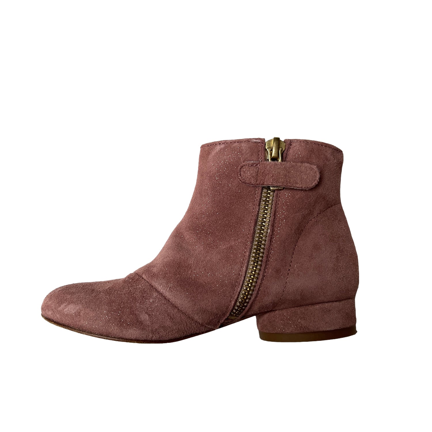 Bonpoint kids pink suede boots with gold shimmer. Zipper closure at side. Iconic cherry on heels. Designer size 27 (EU).