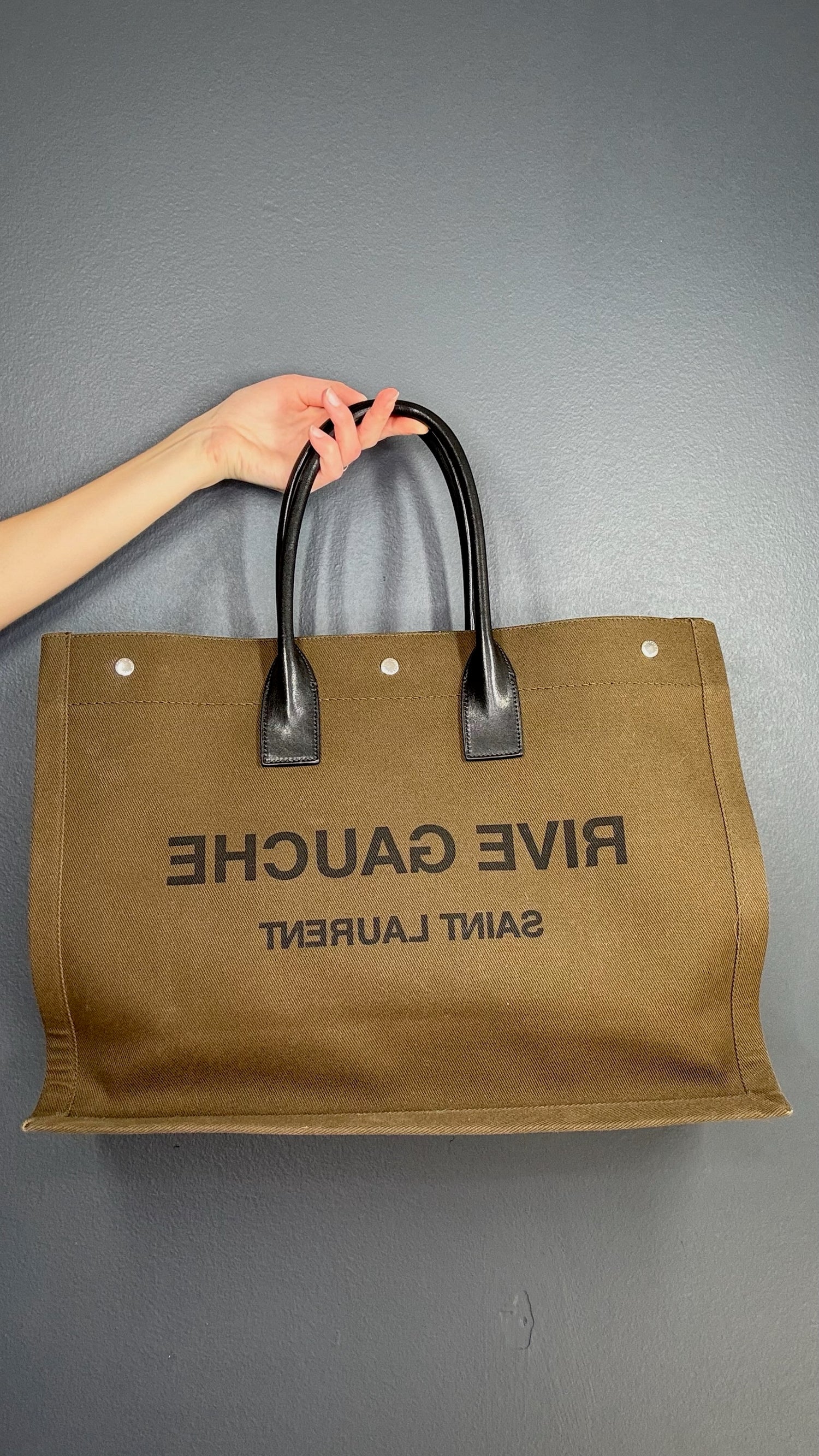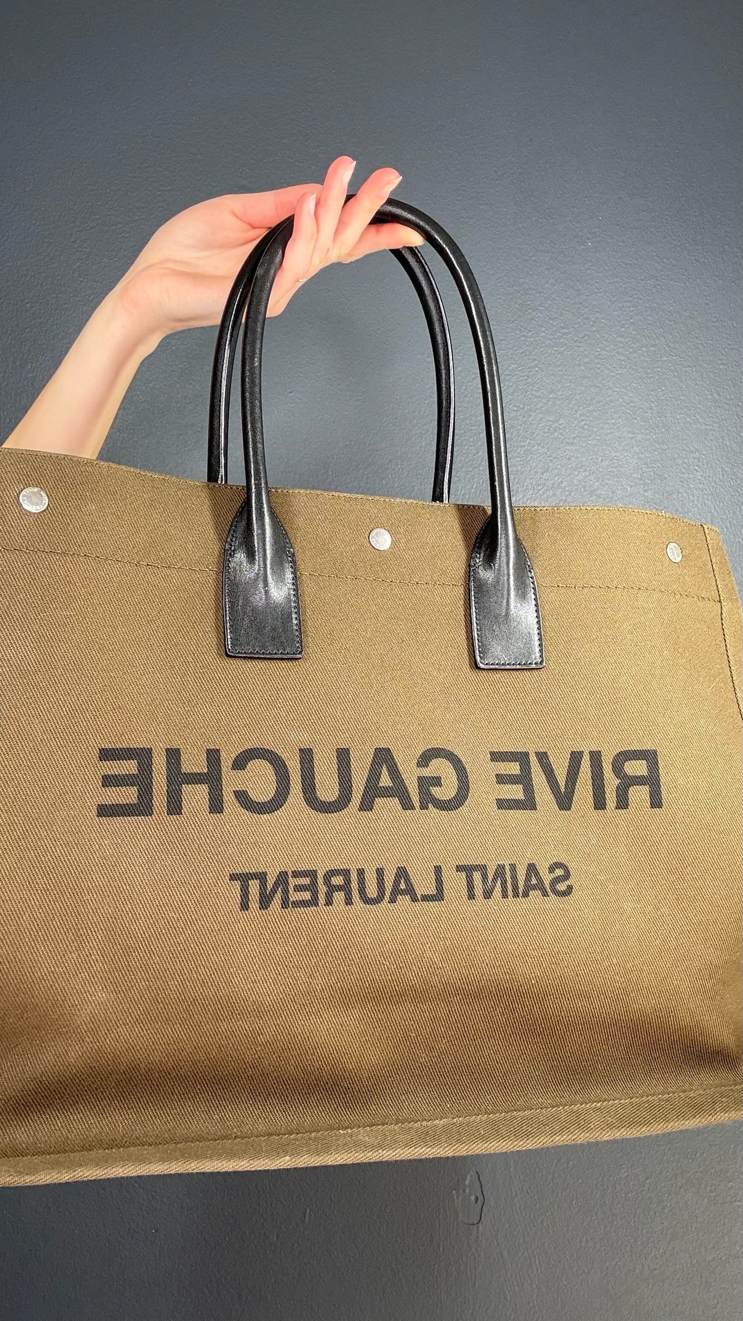 Elevate your style with the Saint Laurent khaki Tote Bag. This elegant accessory features a sleek design and durable construction, perfect for everyday use. The rich brown color adds a touch of sophistication to any outfit. Canvas and leather.
