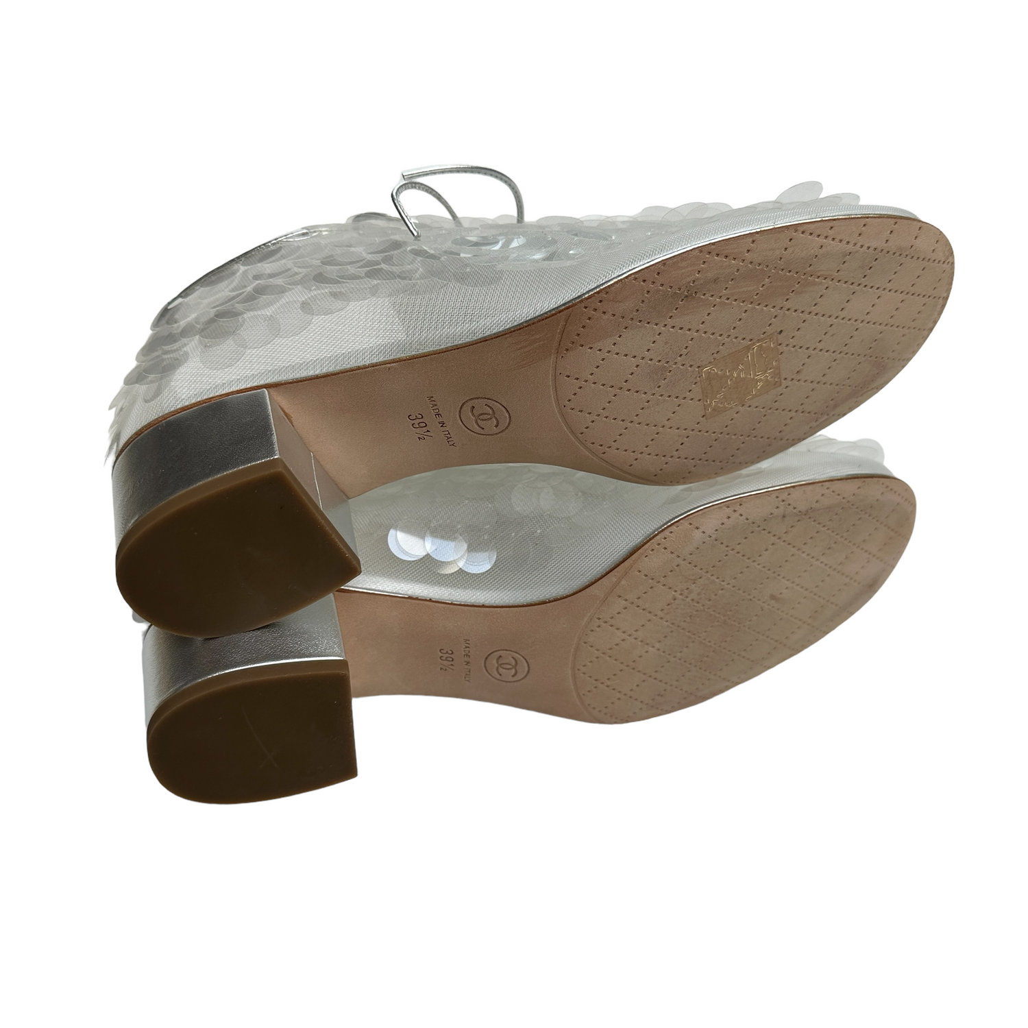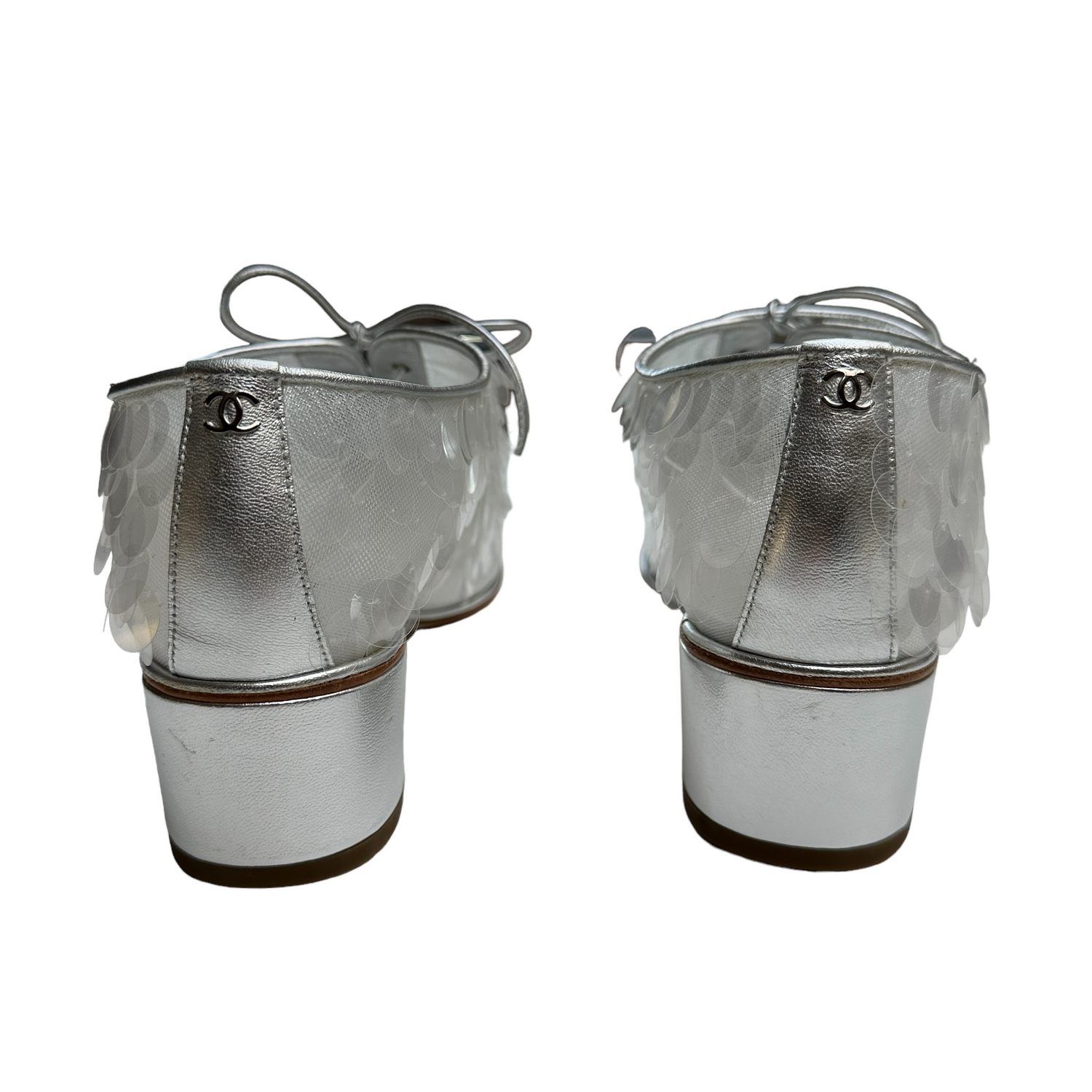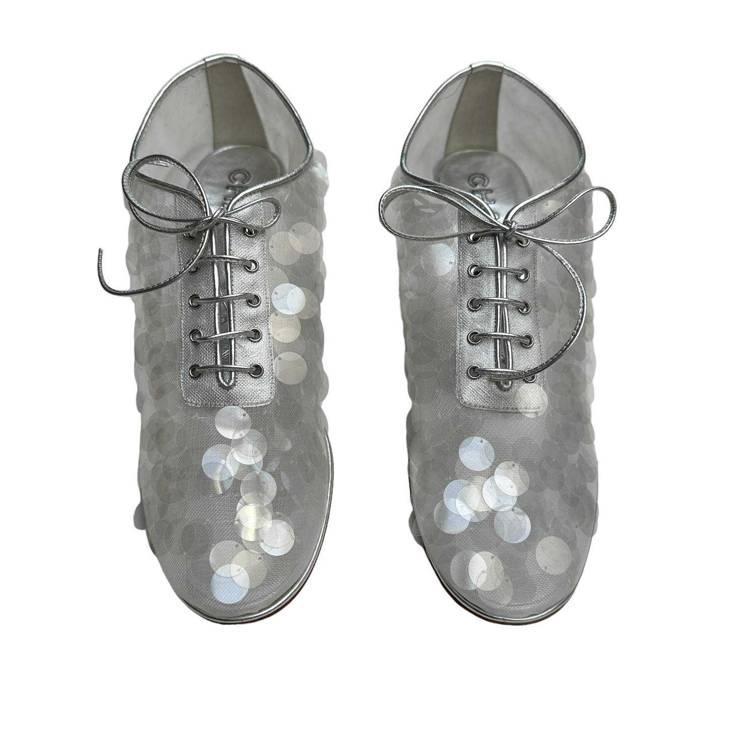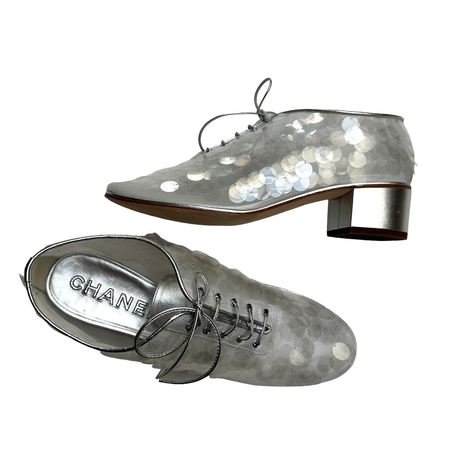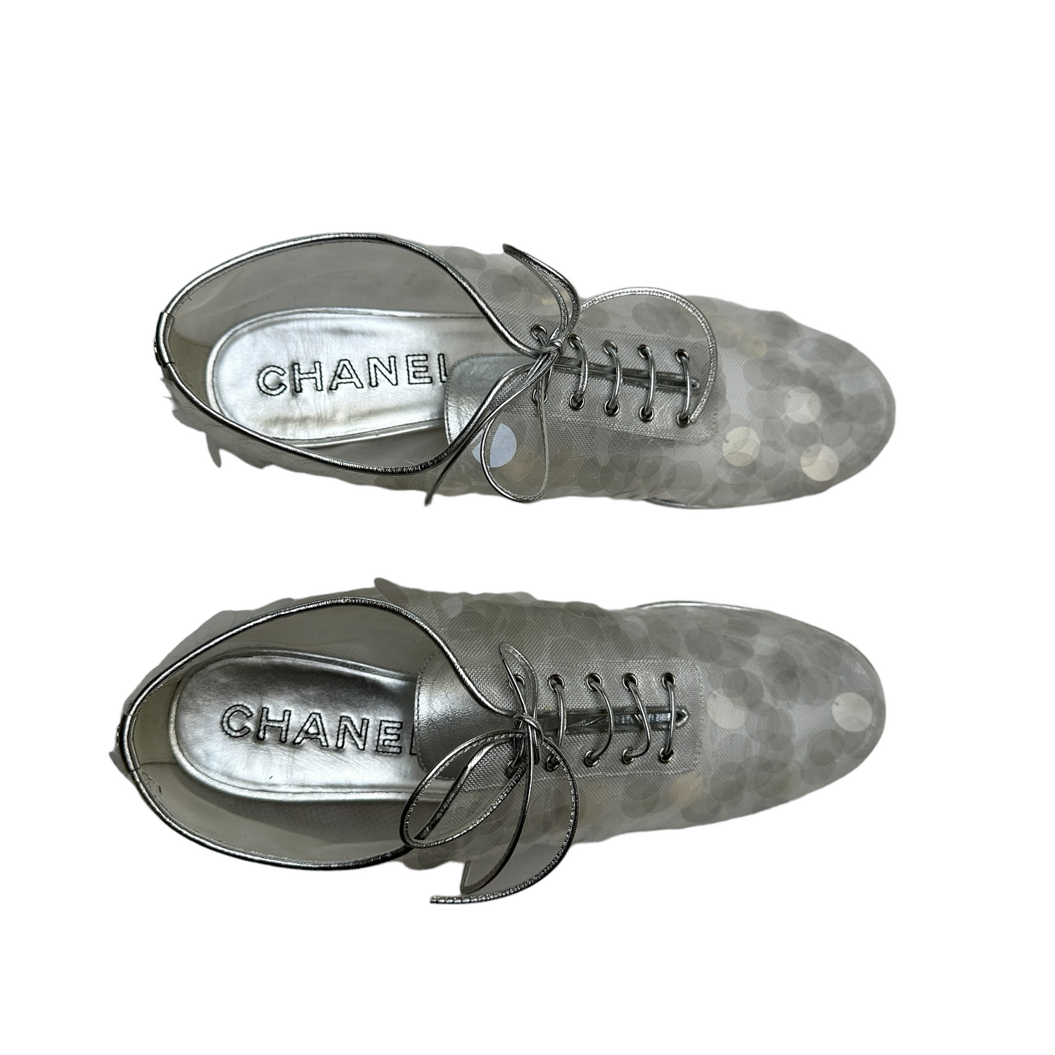 Chanel silver sequins loafers. Laces at top. CC logo at back. Silver leather and clear silver sequins. Round toe. Designer size 39.5