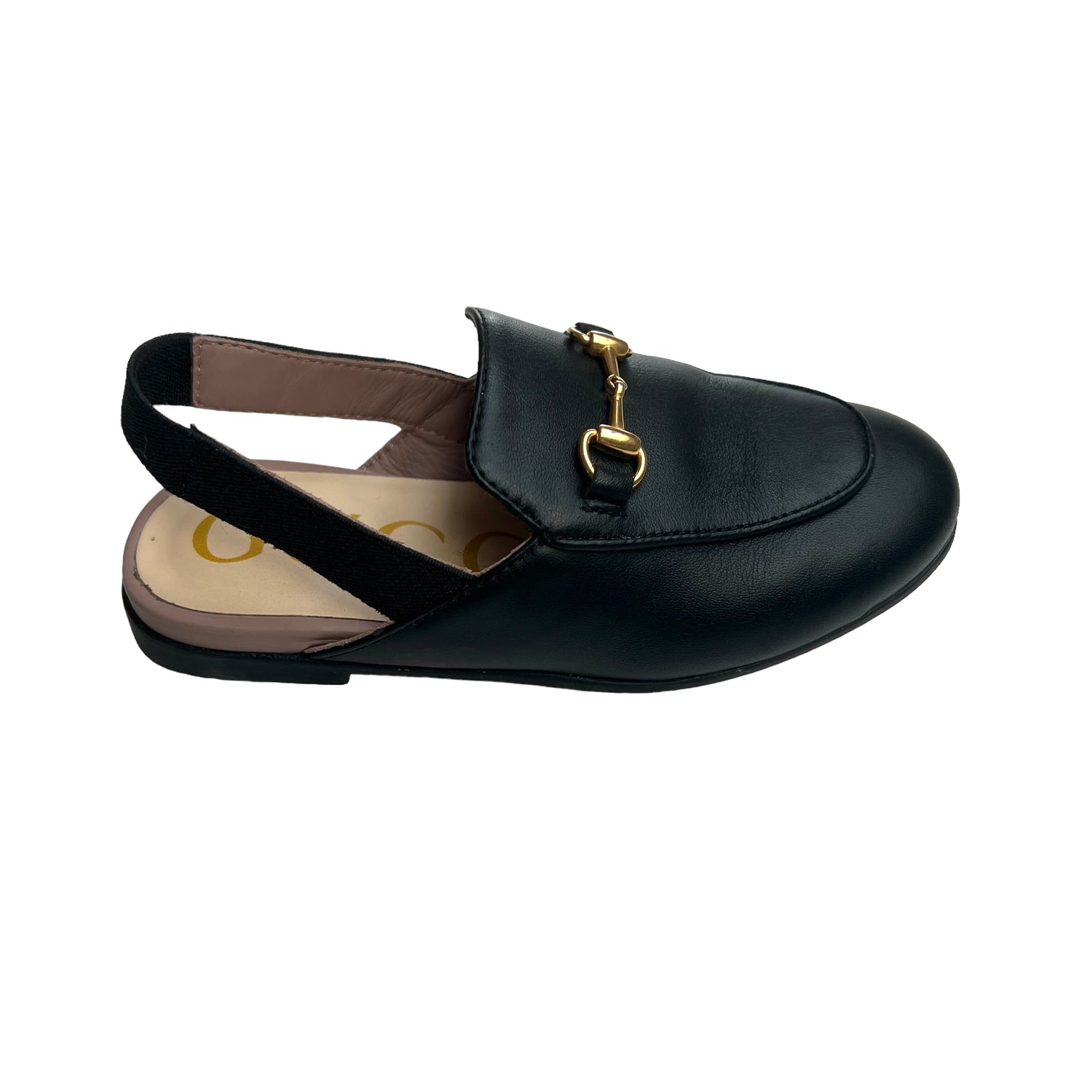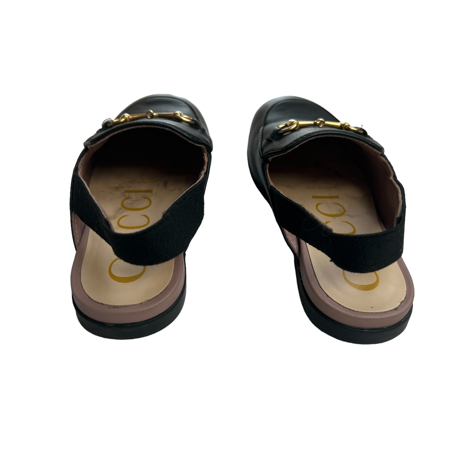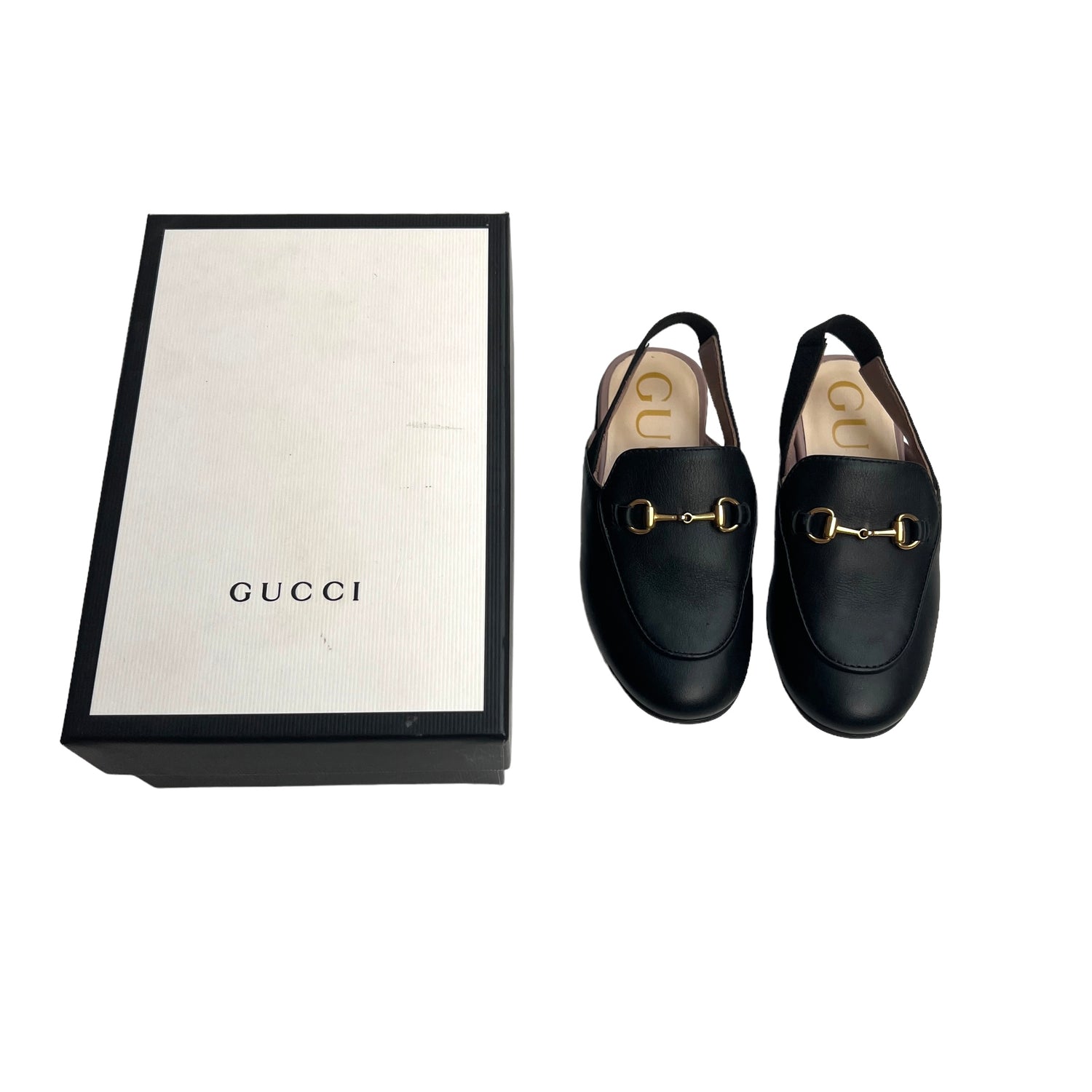 Gucci Princetown slides for kids. Black leather. Gold-tone hardware. Elastic band at back. Designer size Toddler 25.