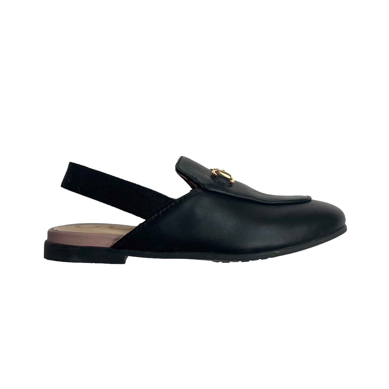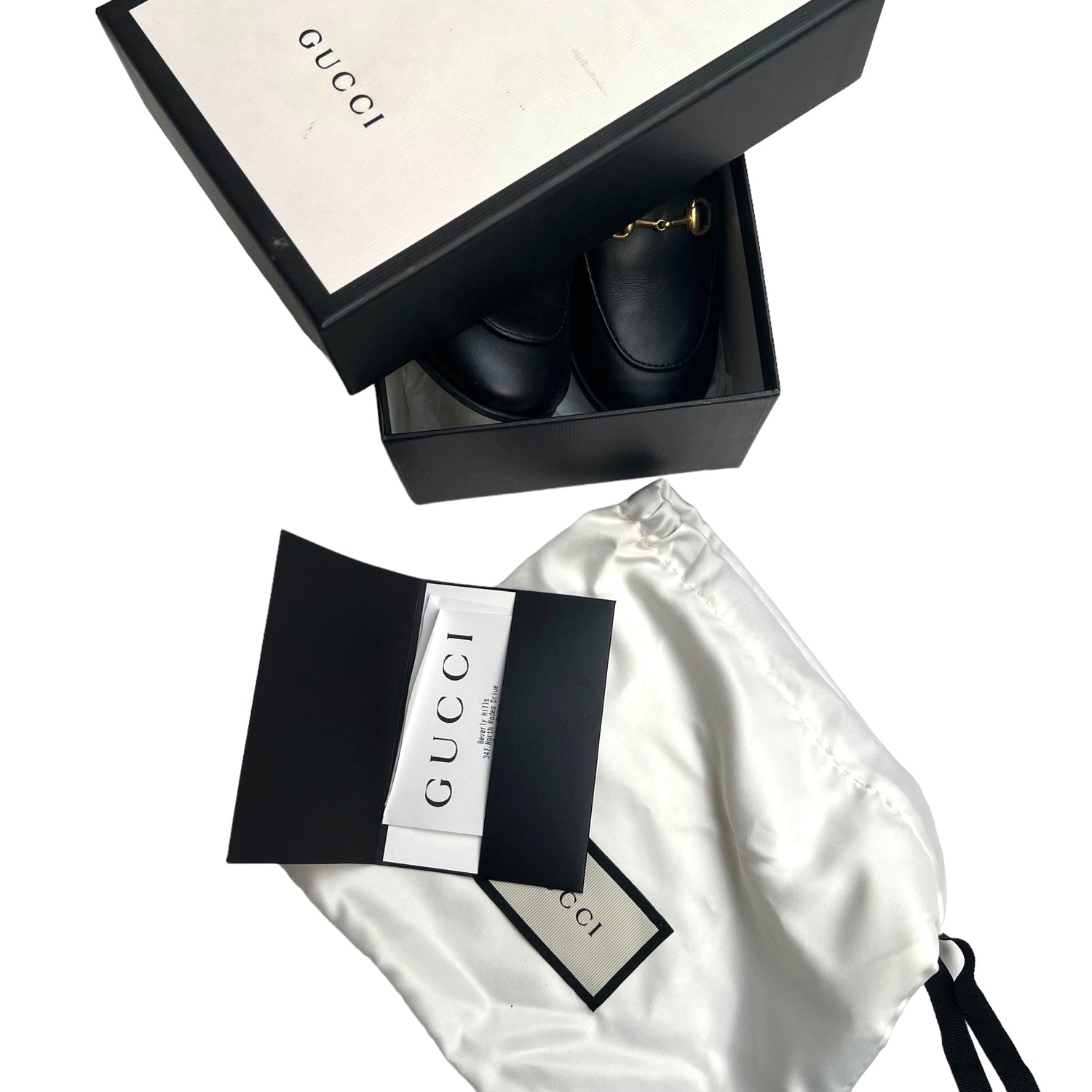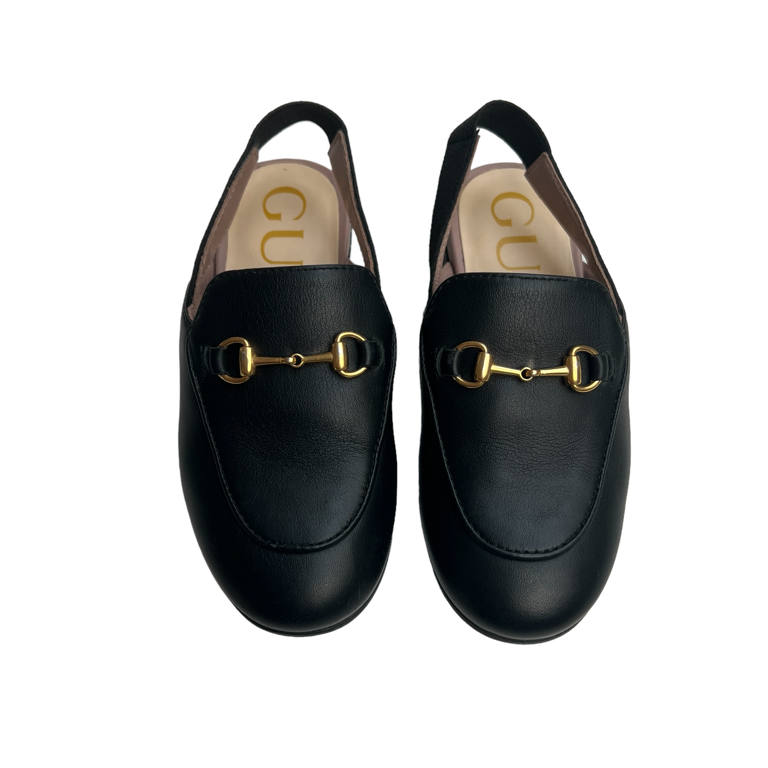 Gucci Princetown slides for kids. Black leather. Gold-tone hardware. Elastic band at back. Designer size Toddler 25.
