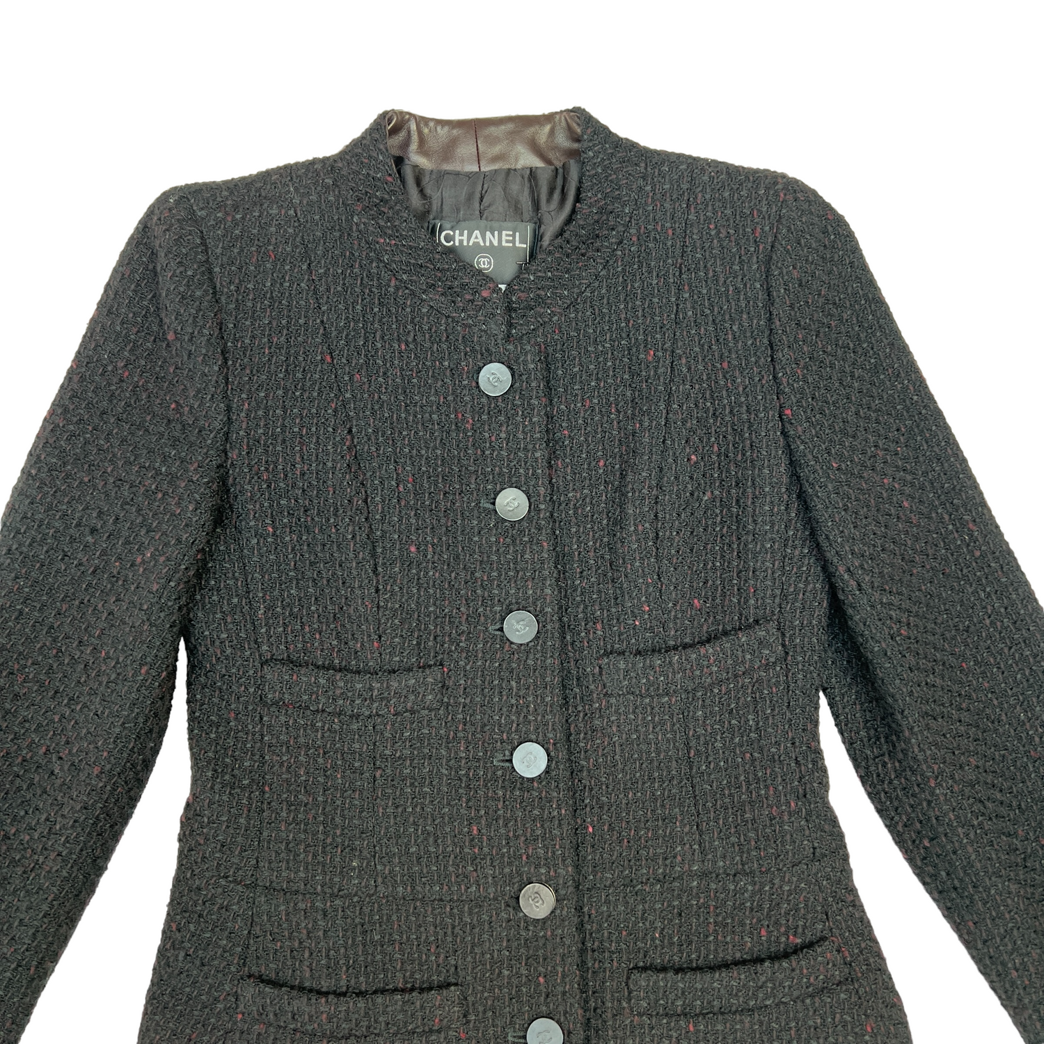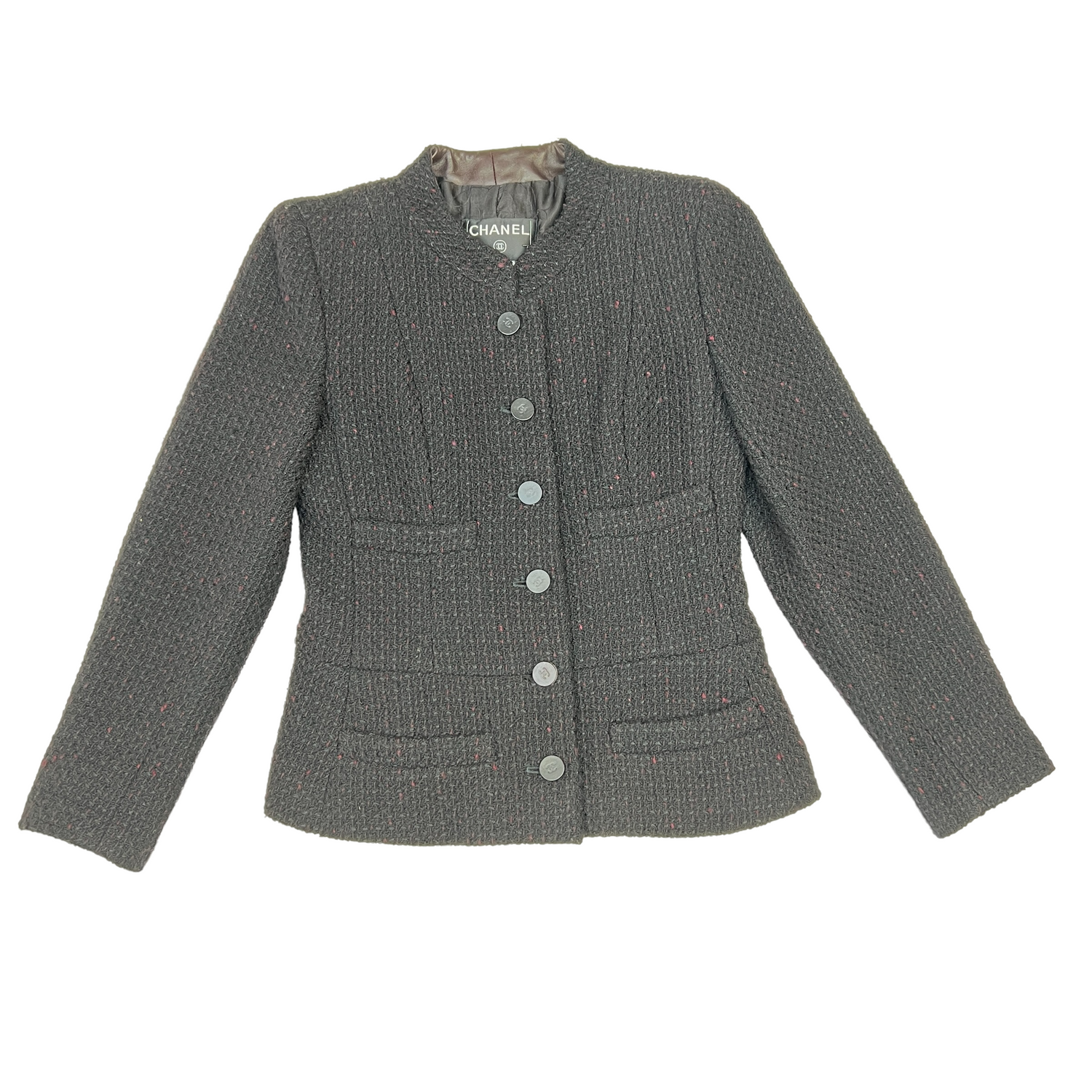 Chanel vintage evening Jacket. From the Fall/Winter 2001 collection by Karl Lagerfeld. Black tweed pattern. Collarless. Slit pockets. CC logo button closure. Designer size 36