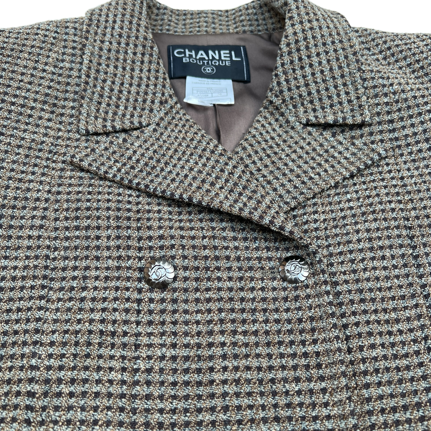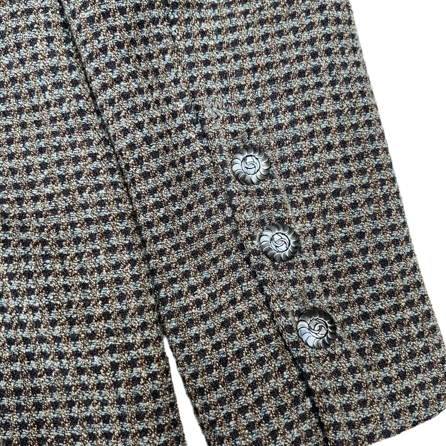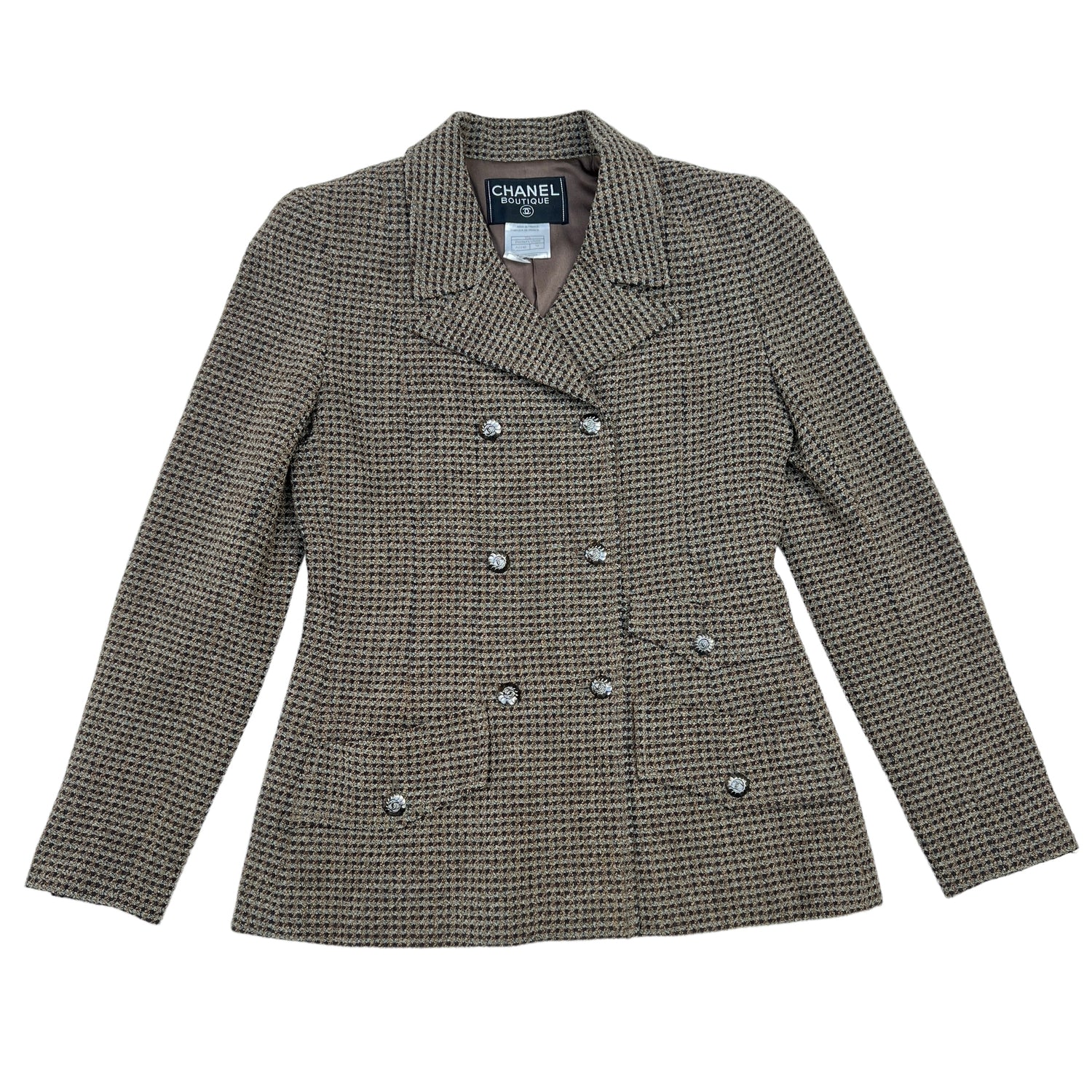 Chanel vintage kaki tweed blazer. Fall 1997 Collection by Karl Lagerfeld. Slit pockets. Double breasted. Pointed collar. CC logo buttons. Designer size 38.