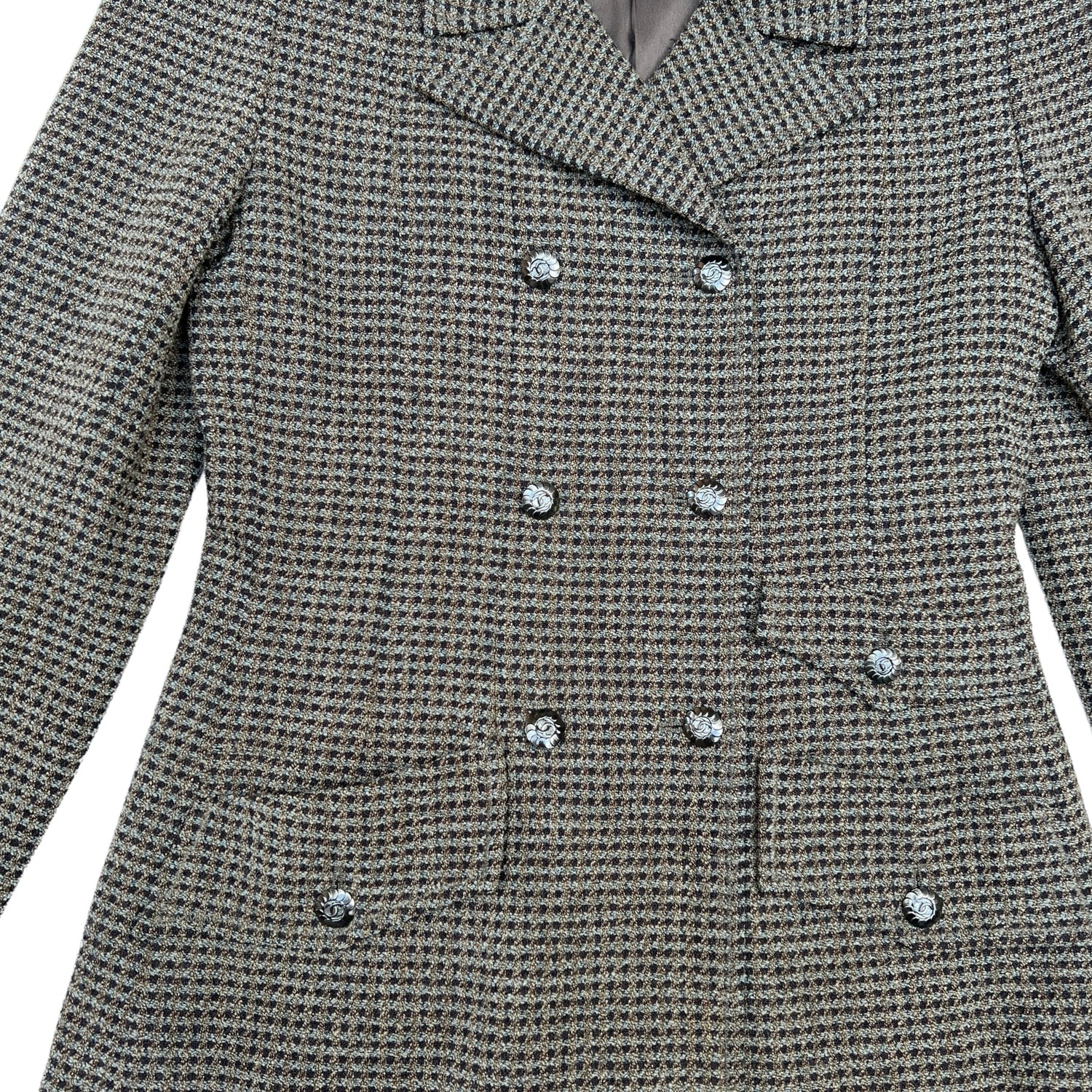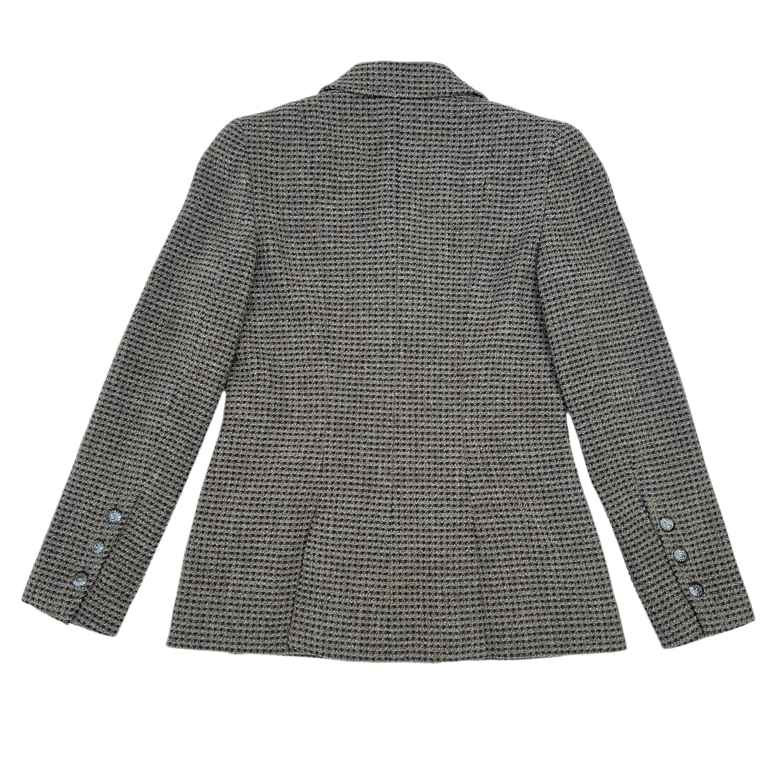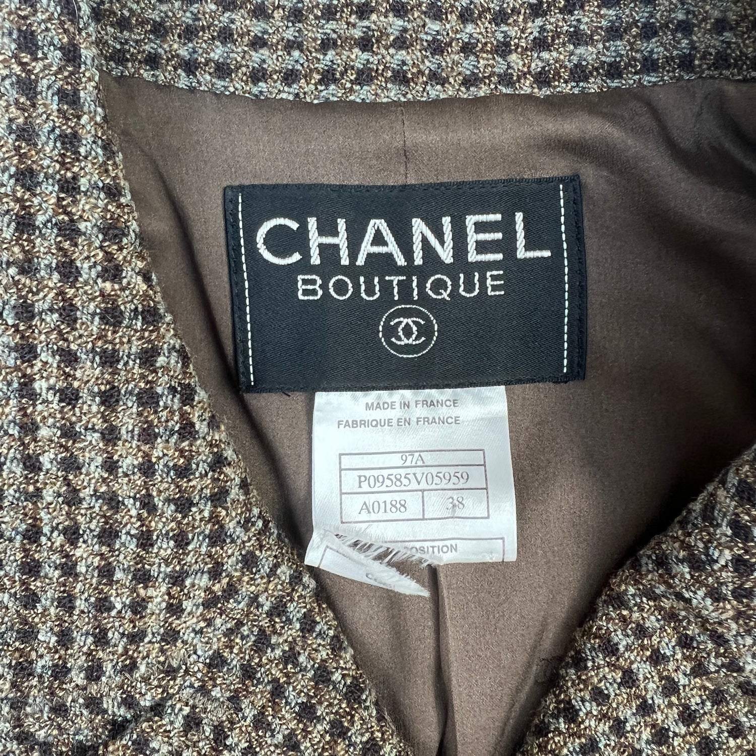 Chanel vintage kaki tweed blazer. Fall 1997 Collection by Karl Lagerfeld. Slit pockets. Double breasted. Pointed collar. CC logo buttons. Designer size 38.