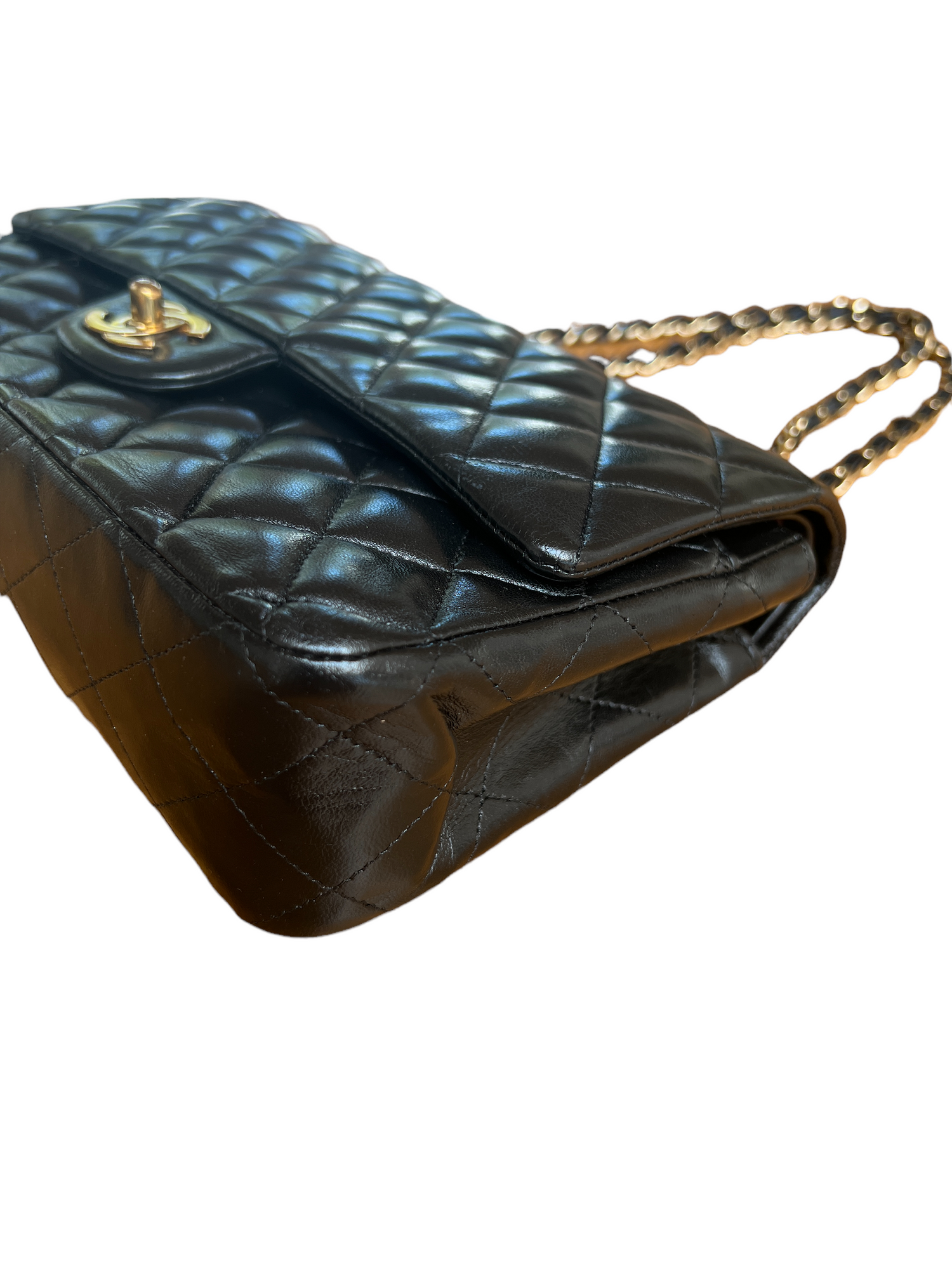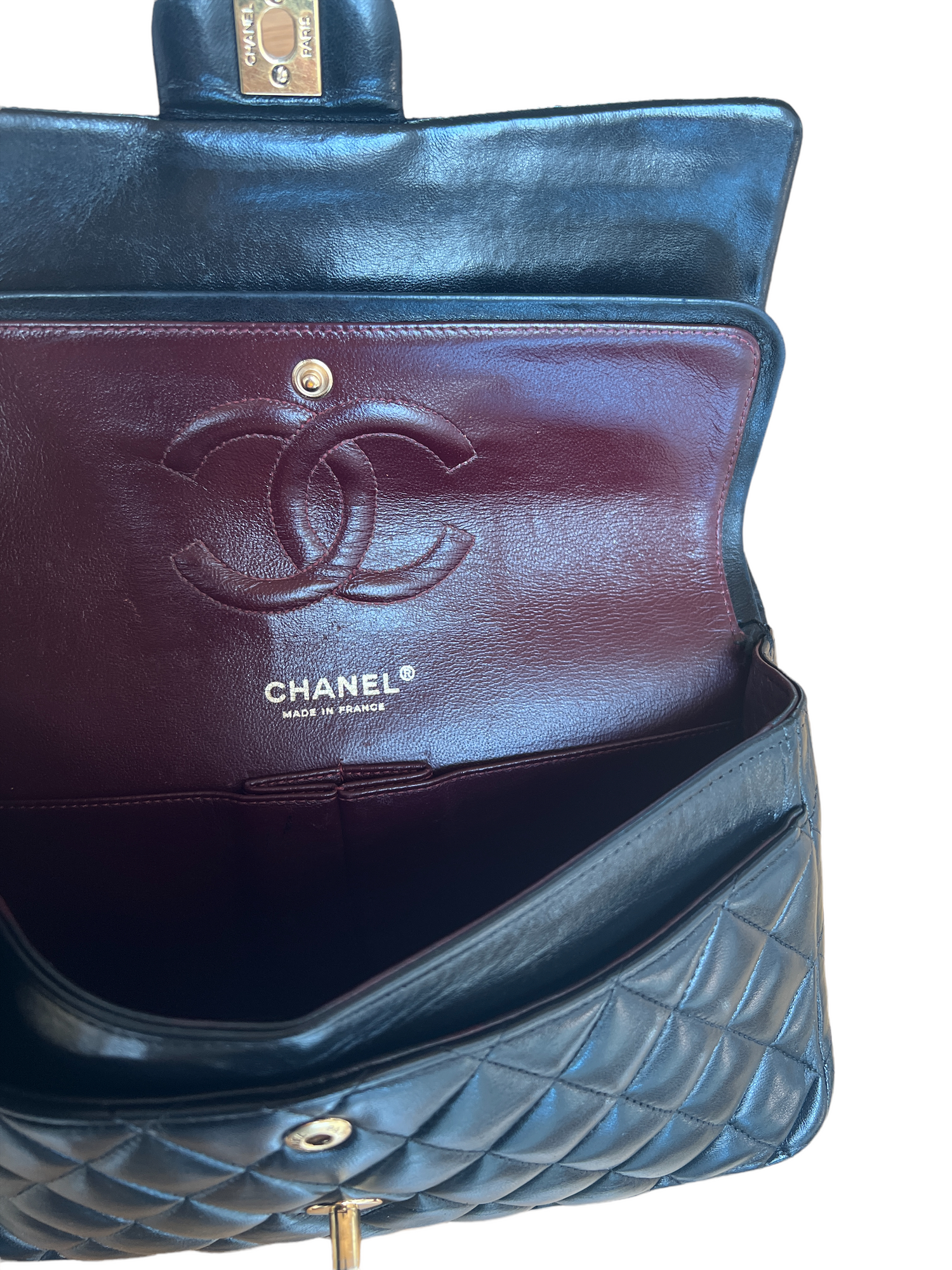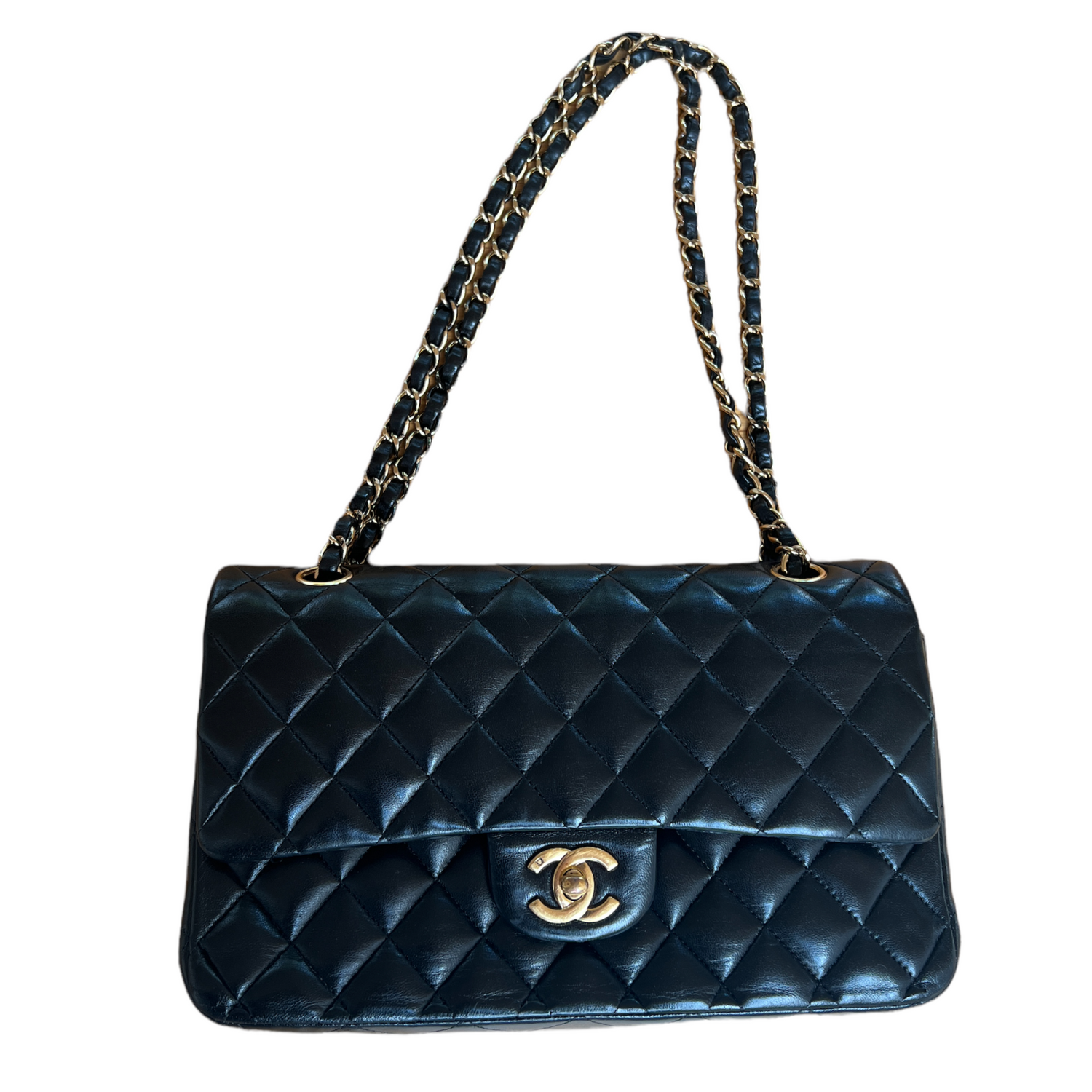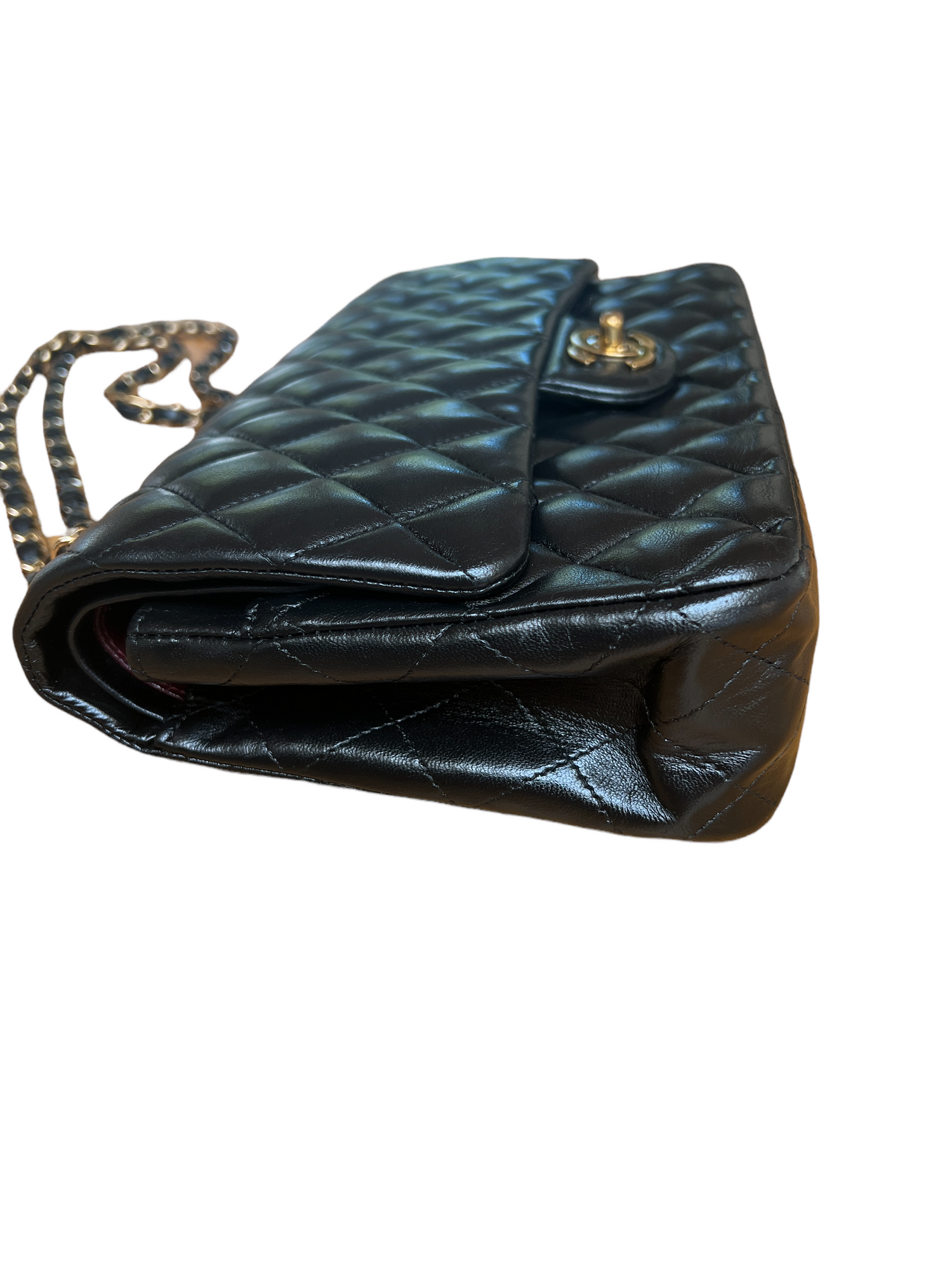 This is a forever bag and staple. This is made of smooth lambskin leather. Gold-tone hardware. Burgundy interior. Double chain to be worn at shoulder or crossbody.