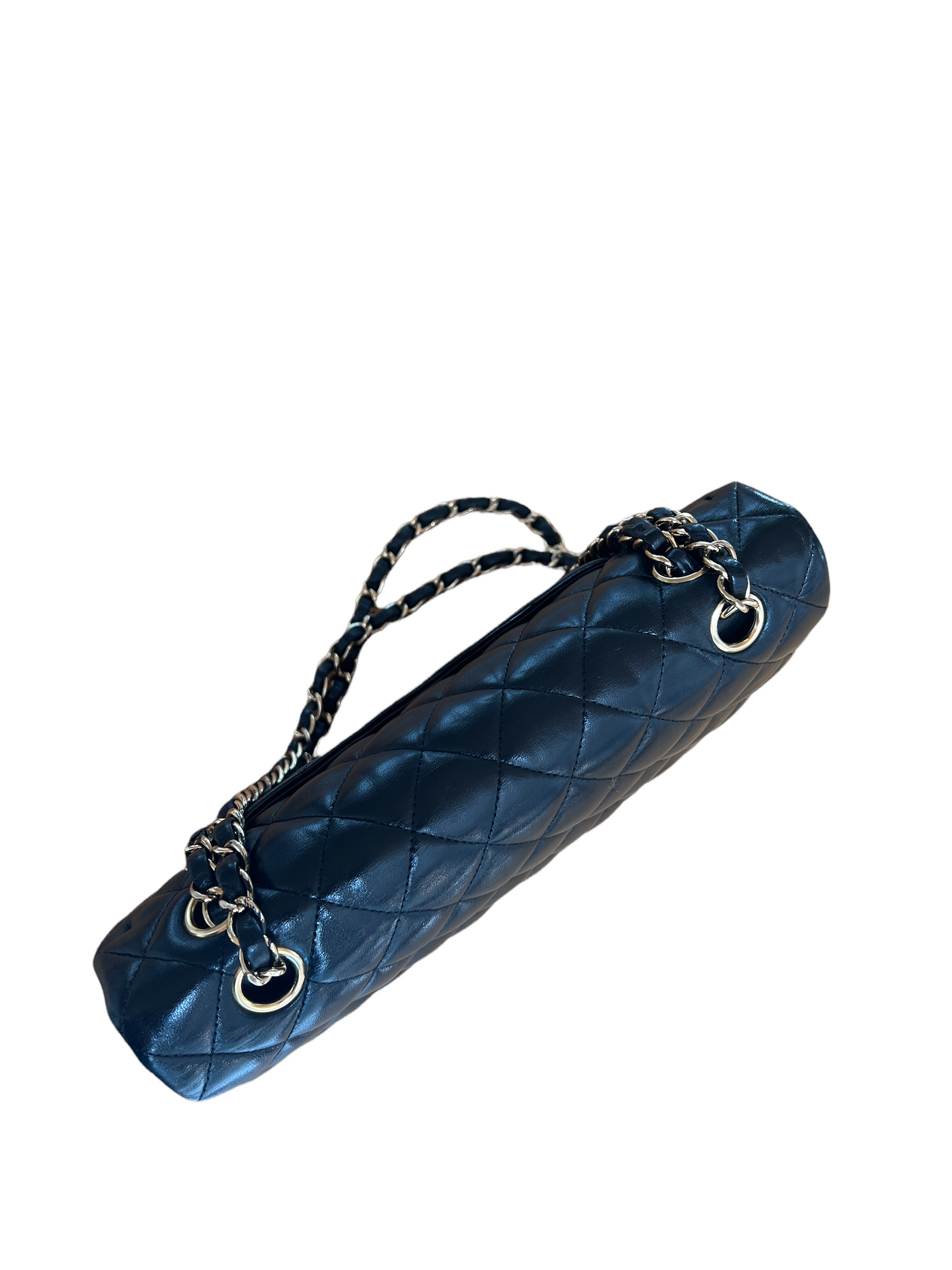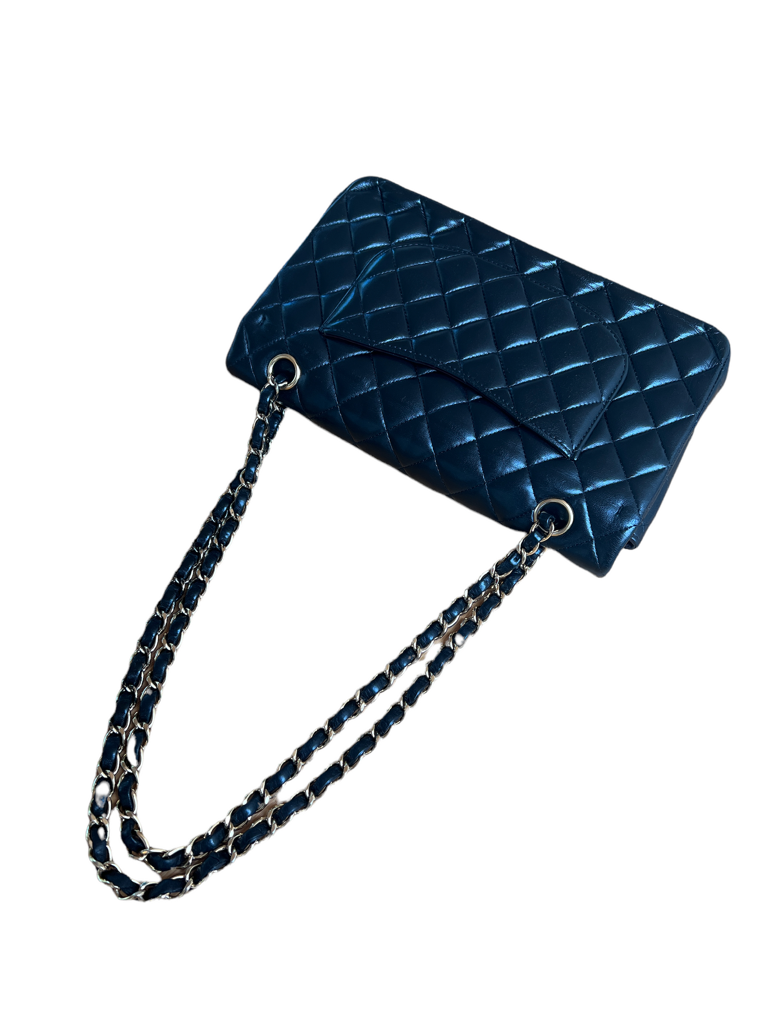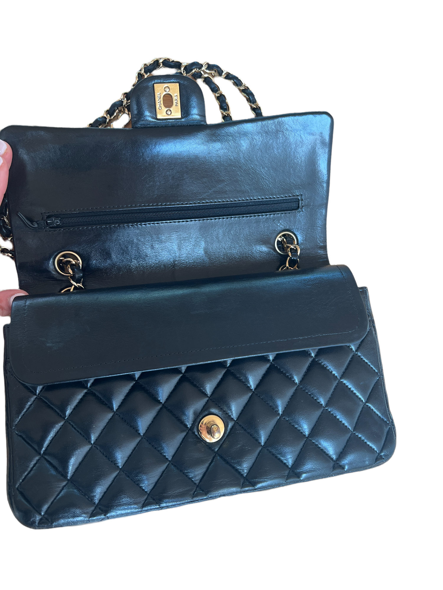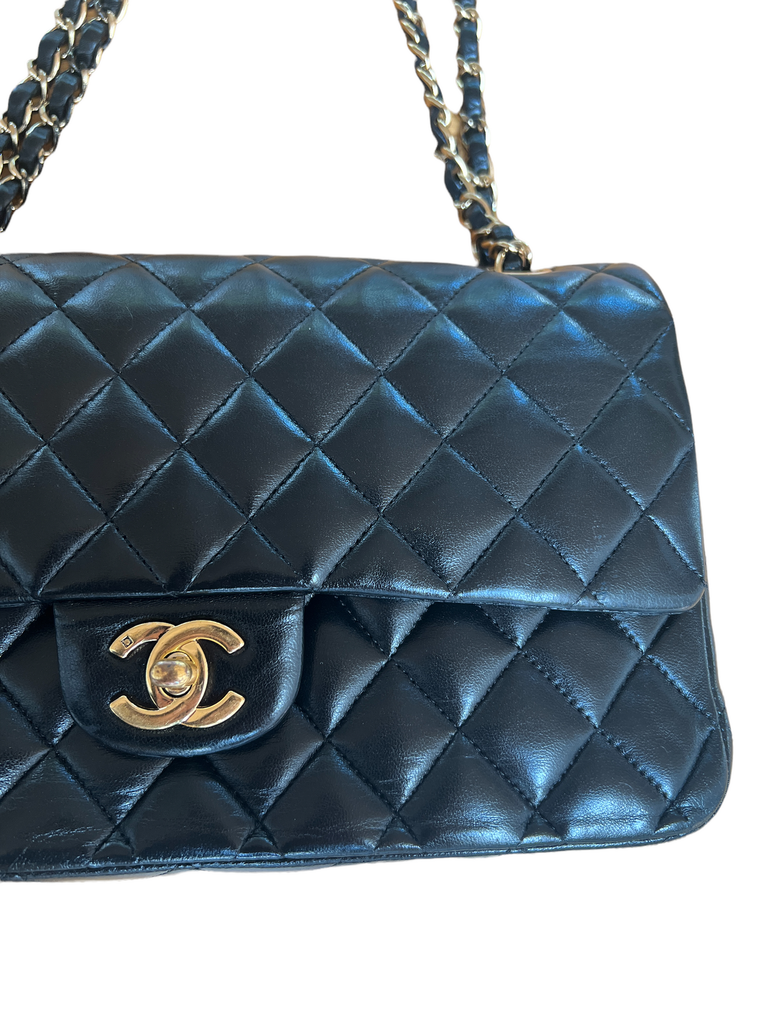 This is a forever bag and staple. This is made of smooth lambskin leather. Gold-tone hardware. Burgundy interior. Double chain to be worn at shoulder or crossbody.