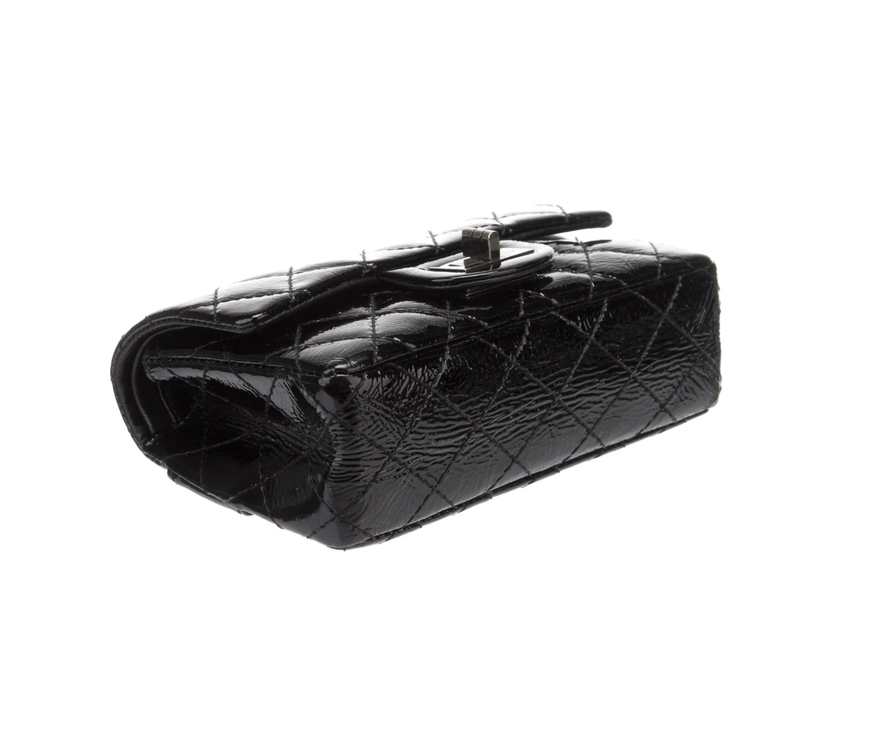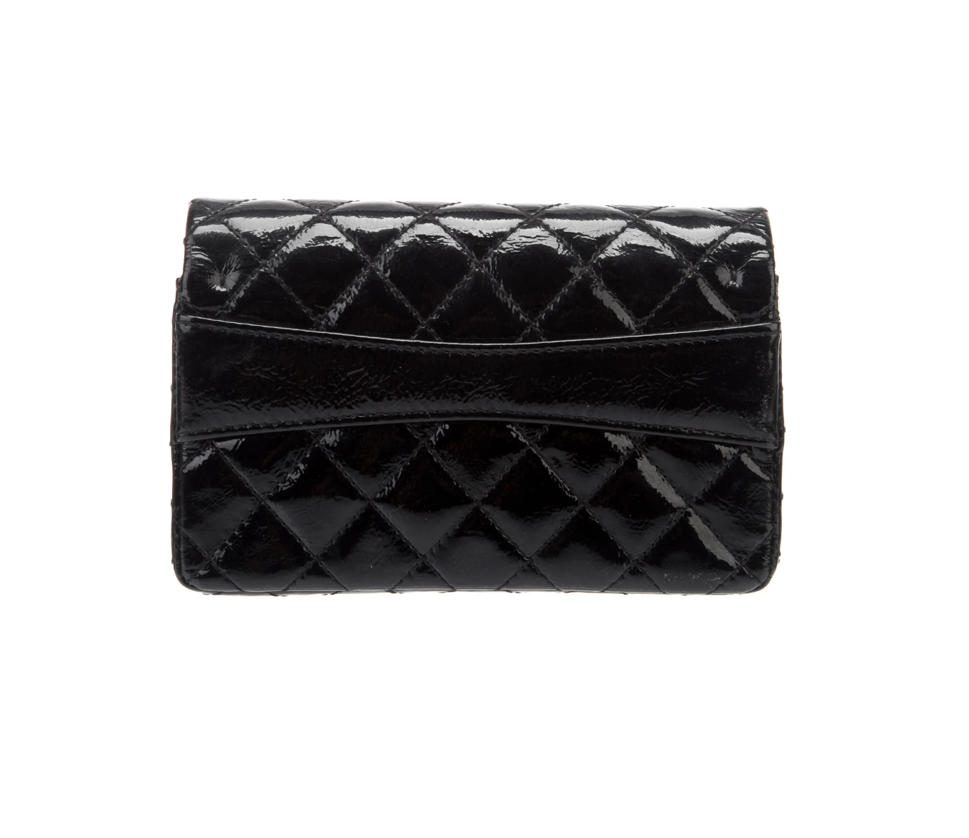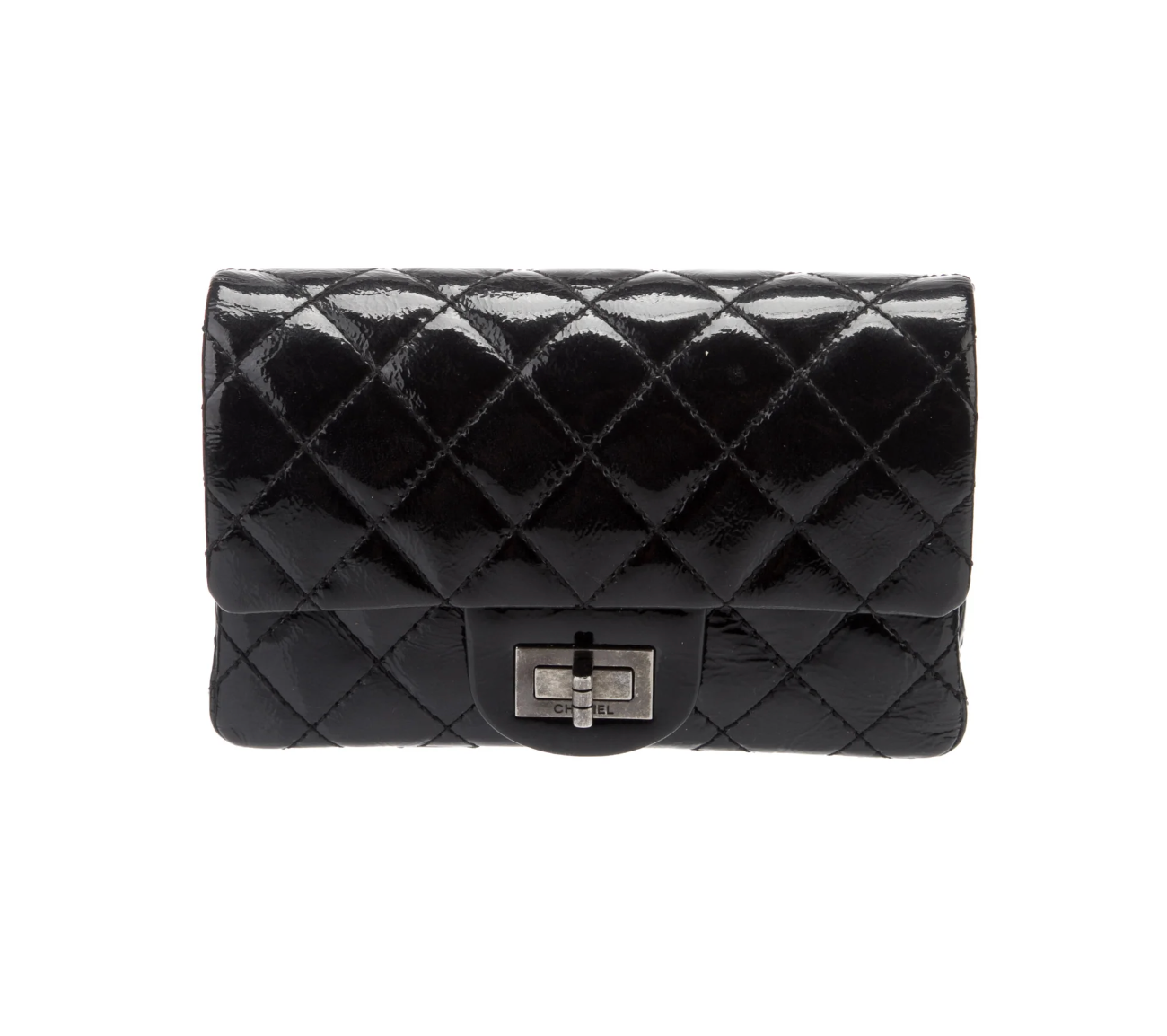 Chanel Reissue clutch. From the 2006-2008 collection by Karl Lagerfeld. Black patent diamond quilted leather. Reissue turn-lock closure at flap. Brushed aged silver-tone hardware. Strap at back to carry around the hand.