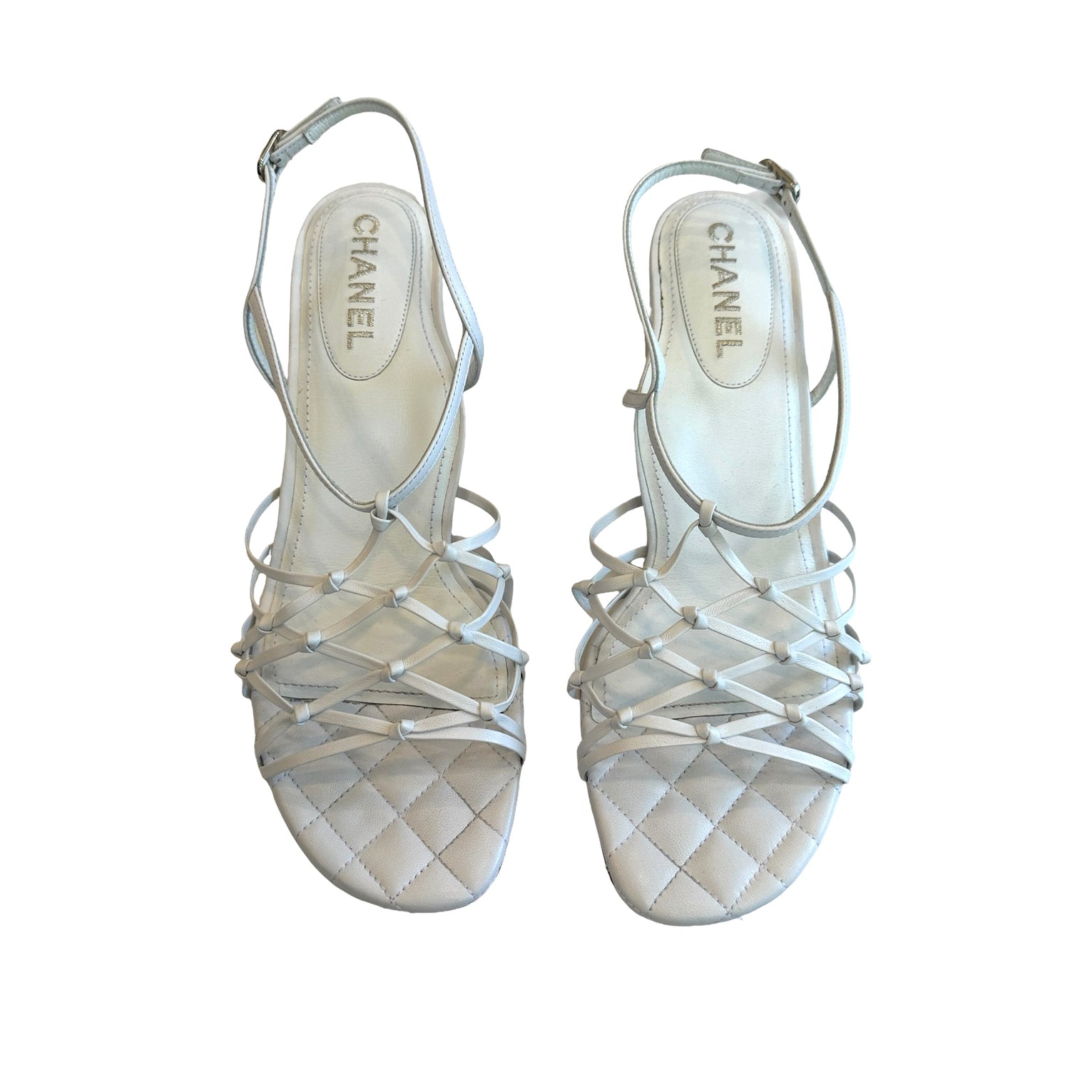 Chanel white leather sandals. 2022 collection. Silver CC logo at sides. Ankle buckle straps. Diamond quilted leather at inner soles. Round square toe with block heels. Designer size 41.